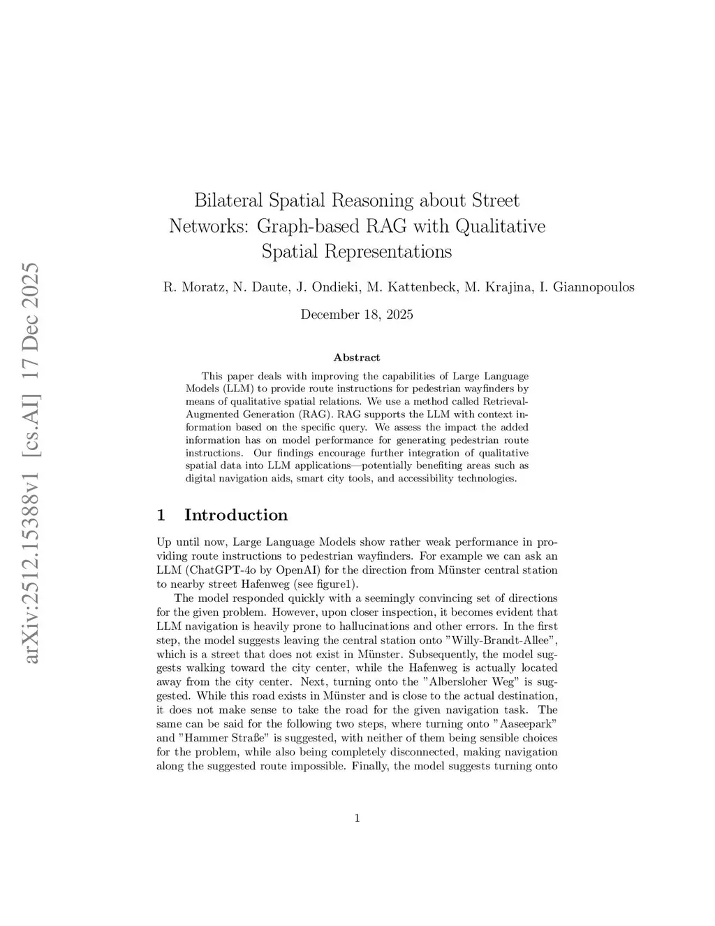 Bilateral Spatial Reasoning about Street Networks: Graph-based RAG with Qualitative Spatial Representations