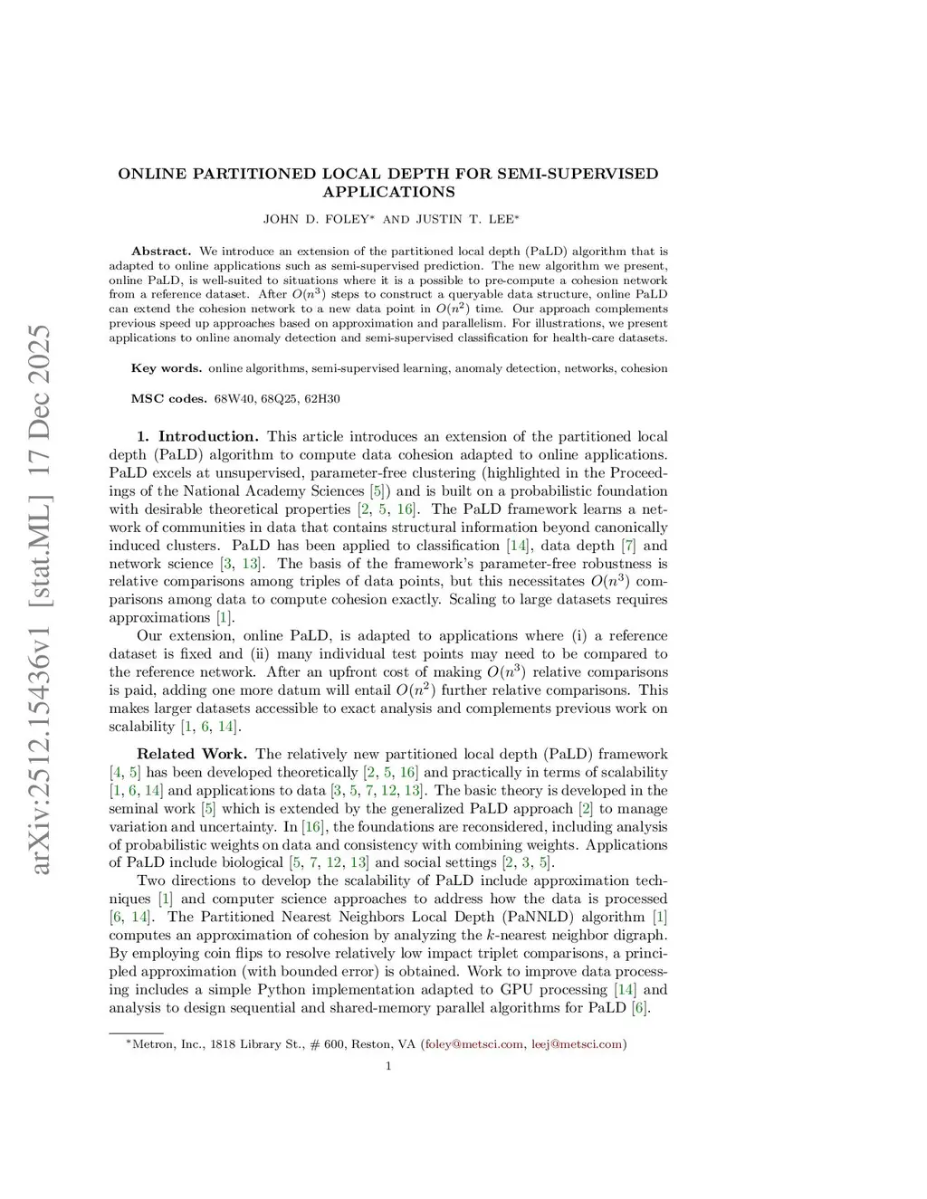 Online Partitioned Local Depth for semi-supervised applications