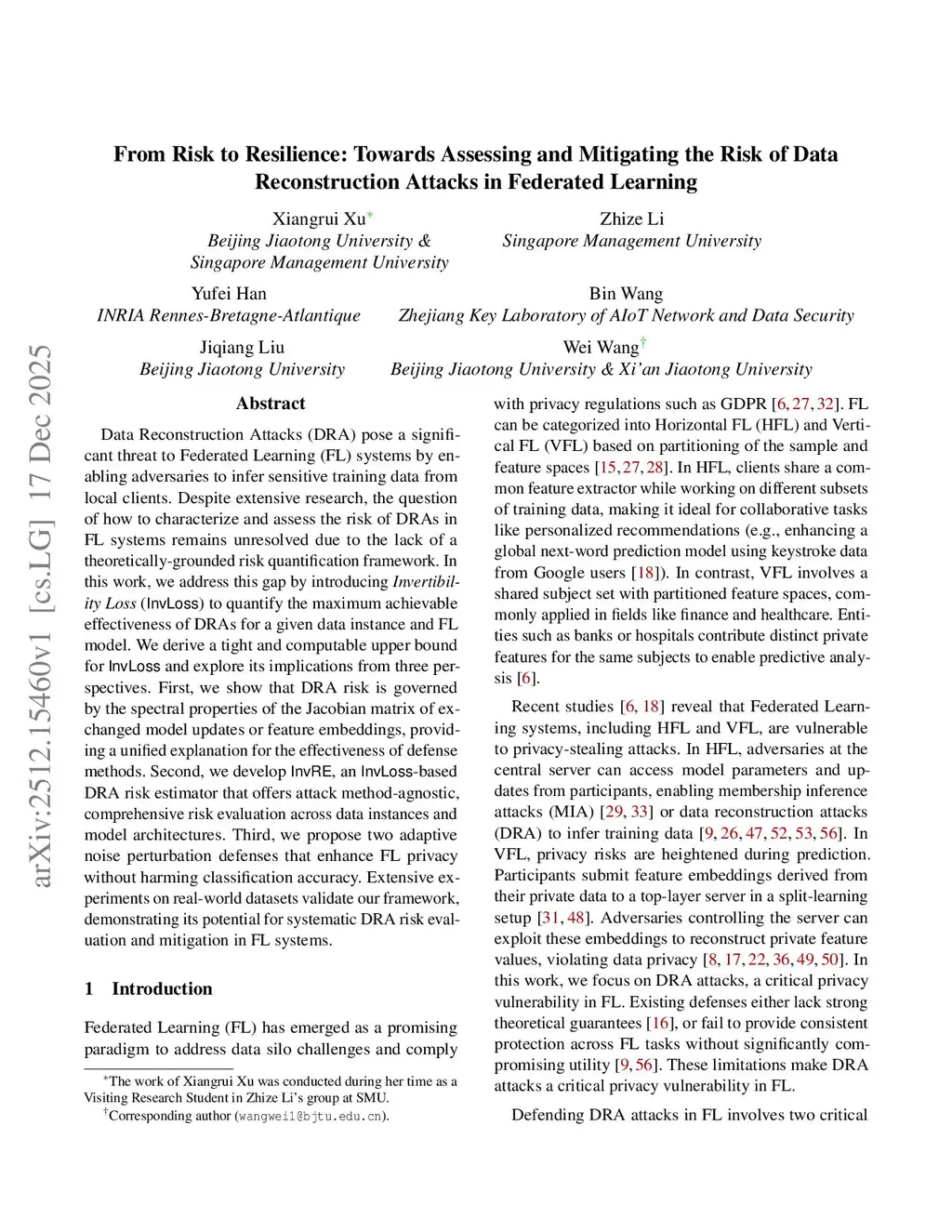 Data Reconstruction Attacks (DRA) pose a significant threat to Federated Learning (FL) systems by enabling adversaries to infer sensitive training data from local clients. Despite extensive research, the question of how to characterize and assess the risk of DRAs in FL systems remains unresolved due to the lack of a theoretically-grounded risk quantification framework. In this work, we address this gap by introducing Invertibility Loss (InvLoss) to quantify the maximum achievable effectiveness of DRAs for a given data instance and FL model. We derive a tight and computable upper bound for InvLoss and explore its implications from three perspectives. First, we show that DRA risk is governed by the spectral properties of the Jacobian matrix of exchanged model updates or feature embeddings, providing a unified explanation for the effectiveness of defense methods. Second, we develop InvRE, an InvLoss-based DRA risk estimator that offers attack method-agnostic, comprehensive risk evaluation across data instances and model architectures. Third, we propose two adaptive noise perturbation defenses that enhance FL privacy without harming classification accuracy. Extensive experiments on real-world datasets validate our framework, demonstrating its potential for systematic DRA risk evaluation and mitigation in FL systems.