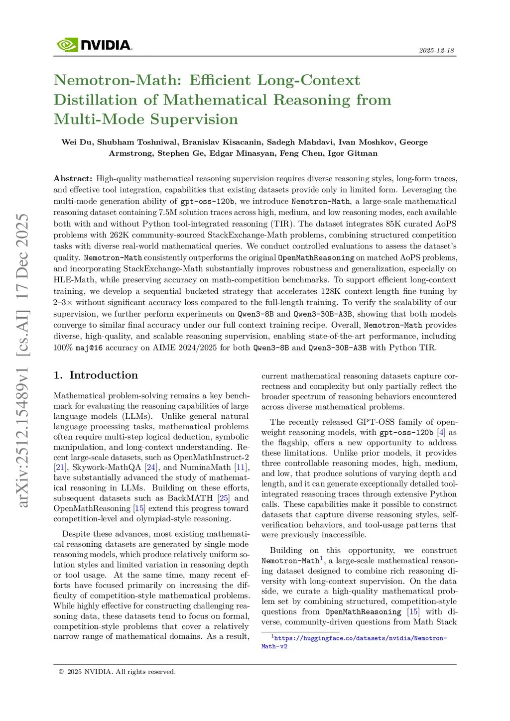 High-quality mathematical reasoning supervision requires diverse reasoning styles, long-form traces, and effective tool integration, capabilities that existing datasets provide only in limited form. Leveraging the multi-mode generation ability of gpt-oss-120b, we introduce Nemotron-Math, a large-scale mathematical reasoning dataset containing 7.5M solution traces across high, medium, and low reasoning modes, each available both with and without Python tool-integrated reasoning (TIR).The dataset integrates 85K curated AoPS problems with 262K community-sourced StackExchange-Math problems, combining structured competition tasks with diverse real-world mathematical queries. We conduct controlled evaluations to assess the dataset quality.Nemotron-Math consistently outperforms the original OpenMathReasoning on matched AoPS problems. Incorporating StackExchange-Math substantially improves robustness and generalization, especially on HLE-Math, while preserving accuracy on math competition benchmarks.To support efficient long-context training, we develop a sequential bucketed strategy that accelerates 128K context-length fine-tuning by 2--3 without significant accuracy loss. Overall, Nemotron-Math enables state-of-the-art performance, including 100\% maj@16 accuracy on AIME 2024 and 2025 with Python TIR.