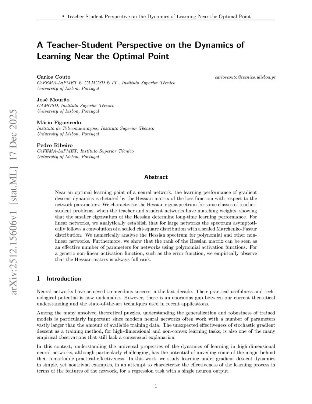 Near an optimal learning point of a neural network, the learning performance of gradient descent dynamics is dictated by the Hessian matrix of the loss function with respect to the network parameters. We characterize the Hessian eigenspectrum for some classes of teacher-student problems, when the teacher and student networks have matching weights, showing that the smaller eigenvalues of the Hessian determine long-time learning performance. For linear networks, we analytically establish that for large networks the spectrum asymptotically follows a convolution of a scaled chi-square distribution with a scaled Marchenko-Pastur distribution. We numerically analyse the Hessian spectrum for polynomial and other non-linear networks. Furthermore, we show that the rank of the Hessian matrix can be seen as an effective number of parameters for networks using polynomial activation functions. For a generic non-linear activation function, such as the error function, we empirically observe that the Hessian matrix is always full rank.