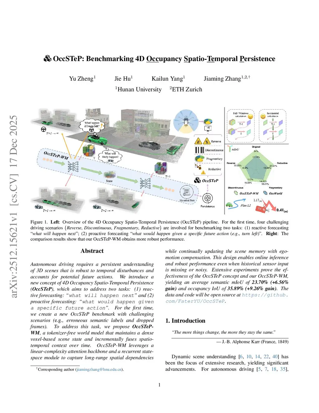 Autonomous driving requires a persistent understanding of 3D scenes that is robust to temporal disturbances and accounts for potential future actions. We introduce a new concept of 4D Occupancy Spatio-Temporal Persistence (OccSTeP), which aims to address two tasks: (1) reactive forecasting: ''what will happen next'' and (2) proactive forecasting: "what would happen given a specific future action". For the first time, we create a new OccSTeP benchmark with challenging scenarios (e.g., erroneous semantic labels and dropped frames). To address this task, we propose OccSTeP-WM, a tokenizer-free world model that maintains a dense voxel-based scene state and incrementally fuses spatio-temporal context over time. OccSTeP-WM leverages a linear-complexity attention backbone and a recurrent state-space module to capture long-range spatial dependencies while continually updating the scene memory with ego-motion compensation. This design enables online inference and robust performance even when historical sensor input is missing or noisy. Extensive experiments prove the effectiveness of the OccSTeP concept and our OccSTeP-WM, yielding an average semantic mIoU of 23.70% (+6.56% gain) and occupancy IoU of 35.89% (+9.26% gain). The data and code will be open source atthis https URL.