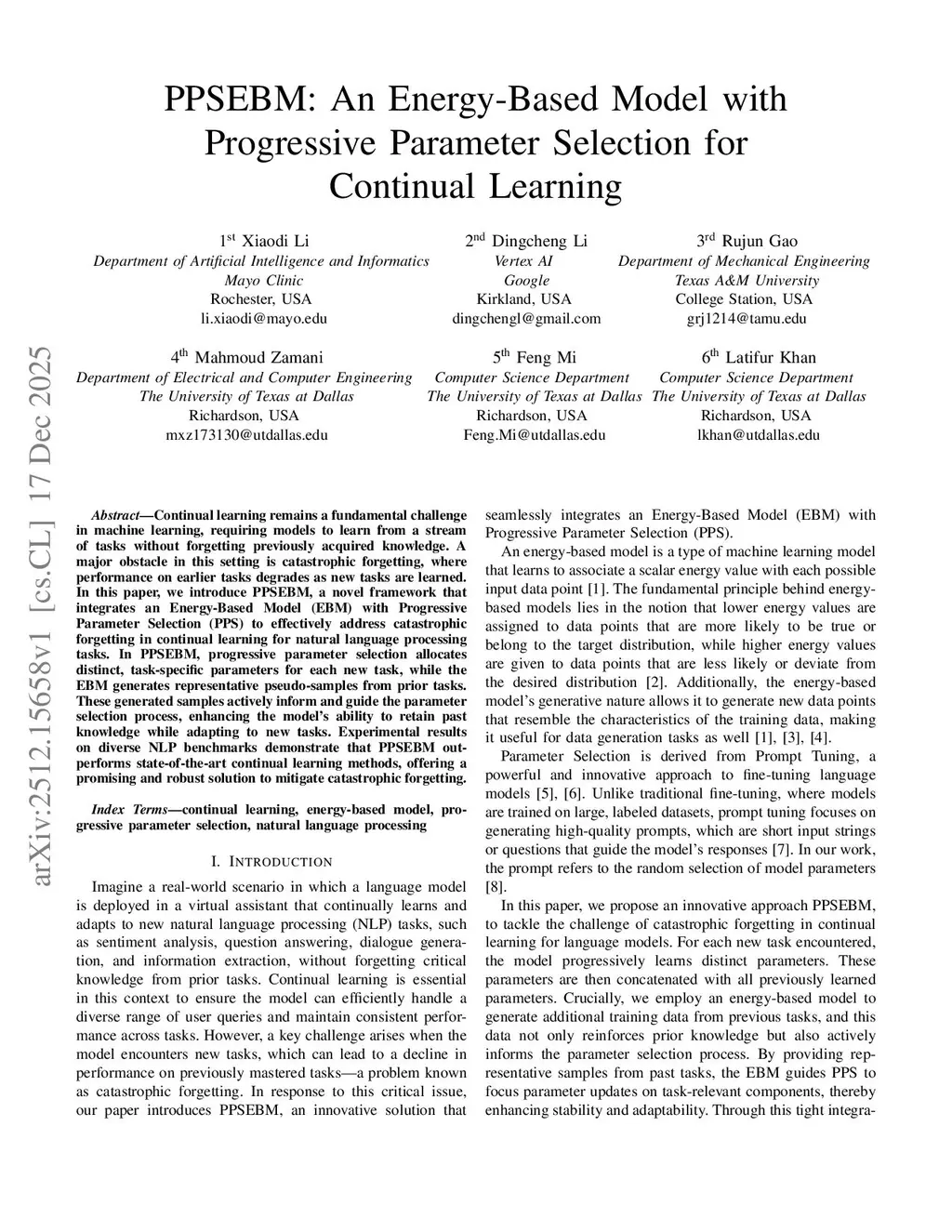 Continual learning remains a fundamental challenge in machine learning, requiring models to learn from a stream of tasks without forgetting previously acquired knowledge. A major obstacle in this setting is catastrophic forgetting, where performance on earlier tasks degrades as new tasks are learned. In this paper, we introduce PPSEBM, a novel framework that integrates an Energy-Based Model (EBM) with Progressive Parameter Selection (PPS) to effectively address catastrophic forgetting in continual learning for natural language processing tasks. In PPSEBM, progressive parameter selection allocates distinct, task-specific parameters for each new task, while the EBM generates representative pseudo-samples from prior tasks. These generated samples actively inform and guide the parameter selection process, enhancing the model's ability to retain past knowledge while adapting to new tasks. Experimental results on diverse NLP benchmarks demonstrate that PPSEBM outperforms state-of-the-art continual learning methods, offering a promising and robust solution to mitigate catastrophic forgetting.