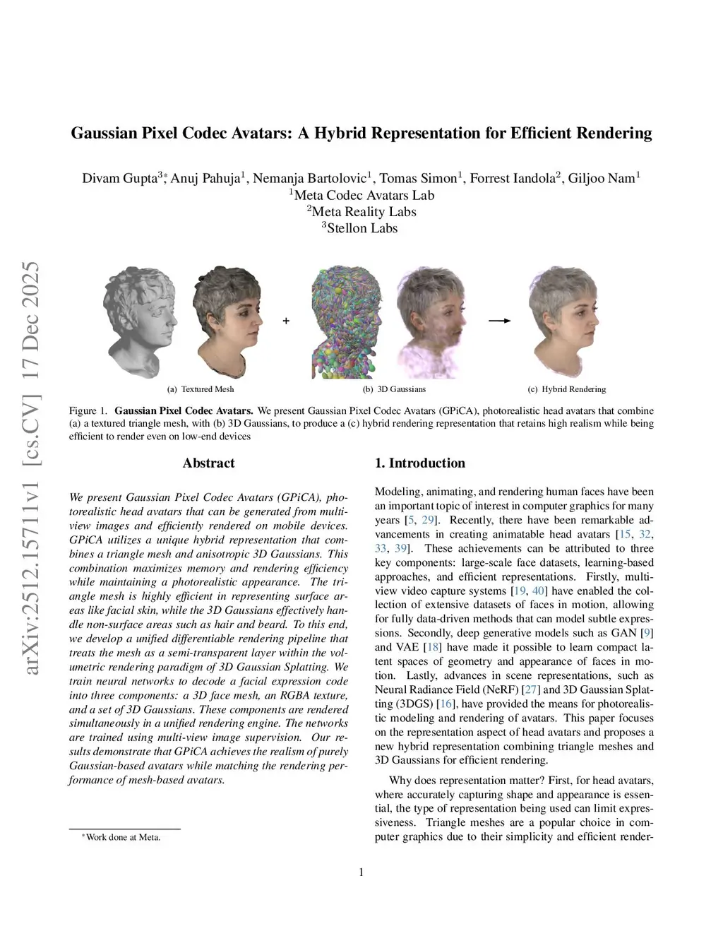 We present Gaussian Pixel Codec Avatars (GPiCA), photorealistic head avatars that can be generated from multi-view images and efficiently rendered on mobile devices. GPiCA utilizes a unique hybrid representation that combines a triangle mesh and anisotropic 3D Gaussians. This combination maximizes memory and rendering efficiency while maintaining a photorealistic appearance. The triangle mesh is highly efficient in representing surface areas like facial skin, while the 3D Gaussians effectively handle non-surface areas such as hair and beard. To this end, we develop a unified differentiable rendering pipeline that treats the mesh as a semi-transparent layer within the volumetric rendering paradigm of 3D Gaussian Splatting. We train neural networks to decode a facial expression code into three components: a 3D face mesh, an RGBA texture, and a set of 3D Gaussians. These components are rendered simultaneously in a unified rendering engine. The networks are trained using multi-view image supervision. Our results demonstrate that GPiCA achieves the realism of purely Gaussian-based avatars while matching the rendering performance of mesh-based avatars.