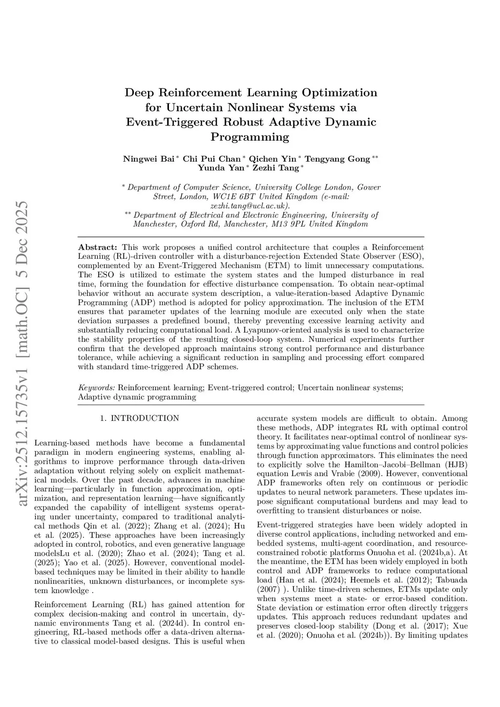 This work proposes a unified control architecture that couples a Reinforcement Learning (RL)-driven controller with a disturbance-rejection Extended State Observer (ESO), complemented by an Event-Triggered Mechanism (ETM) to limit unnecessary computations. The ESO is utilized to estimate the system states and the lumped disturbance in real time, forming the foundation for effective disturbance compensation. To obtain near-optimal behavior without an accurate system description, a value-iteration-based Adaptive Dynamic Programming (ADP) method is adopted for policy approximation. The inclusion of the ETM ensures that parameter updates of the learning module are executed only when the state deviation surpasses a predefined bound, thereby preventing excessive learning activity and substantially reducing computational load. A Lyapunov-oriented analysis is used to characterize the stability properties of the resulting closed-loop system. Numerical experiments further confirm that the developed approach maintains strong control performance and disturbance tolerance, while achieving a significant reduction in sampling and processing effort compared with standard time-triggered ADP schemes.