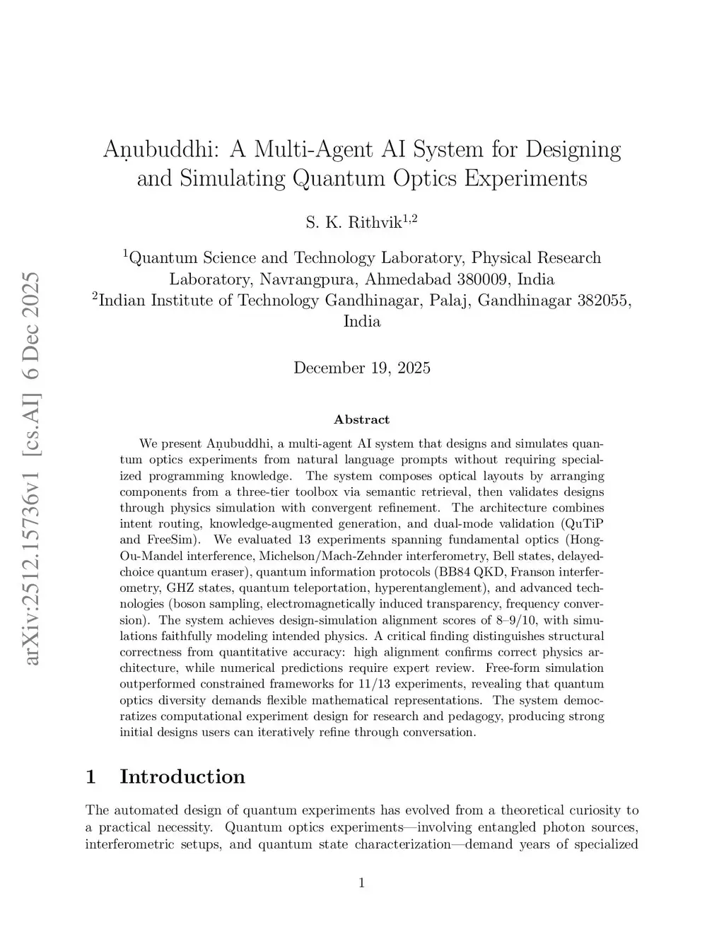 We present Anubuddhi, a multi-agent AI system that designs and simulates quantum optics experiments from natural language prompts without requiring specialized programming knowledge. The system composes optical layouts by arranging components from a three-tier toolbox via semantic retrieval, then validates designs through physics simulation with convergent refinement. The architecture combines intent routing, knowledge-augmented generation, and dual-mode validation (QuTiP and FreeSim). We evaluated 13 experiments spanning fundamental optics (Hong-Ou-Mandel interference, Michelson/Mach-Zehnder interferometry, Bell states, delayed-choice quantum eraser), quantum information protocols (BB84 QKD, Franson interferometry, GHZ states, quantum teleportation, hyperentanglement), and advanced technologies (boson sampling, electromagnetically induced transparency, frequency conversion). The system achieves design-simulation alignment scores of 8--9/10, with simulations faithfully modeling intended physics. A critical finding distinguishes structural correctness from quantitative accuracy: high alignment confirms correct physics architecture, while numerical predictions require expert review. Free-form simulation outperformed constrained frameworks for 11/13 experiments, revealing that quantum optics diversity demands flexible mathematical representations. The system democratizes computational experiment design for research and pedagogy, producing strong initial designs users can iteratively refine through conversation.