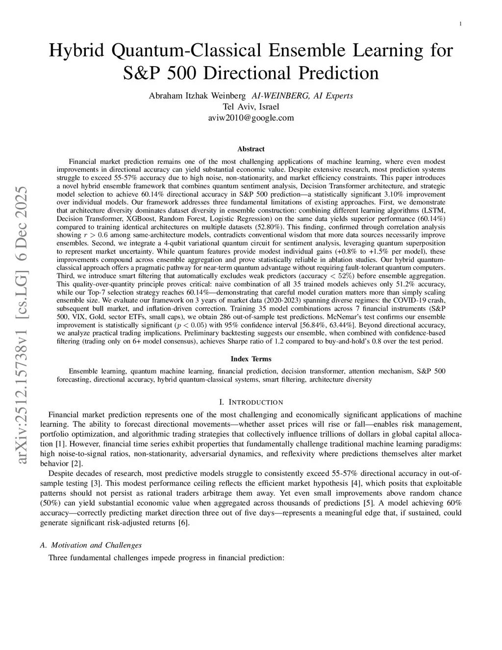 Financial market prediction is a challenging application of machine learning, where even small improvements in directional accuracy can yield substantial value. Most models struggle to exceed 55--57\% accuracy due to high noise, non-stationarity, and market efficiency. We introduce a hybrid ensemble framework combining quantum sentiment analysis, Decision Transformer architecture, and strategic model selection, achieving 60.14\% directional accuracy on S\&P 500 prediction, a 3.10\% improvement over individual models.Our framework addresses three limitations of prior approaches. First, architecture diversity dominates dataset diversity: combining different learning algorithms (LSTM, Decision Transformer, XGBoost, Random Forest, Logistic Regression) on the same data outperforms training identical architectures on multiple datasets (60.14\% vs.\ 52.80\%), confirmed by correlation analysis ( among same-architecture models). Second, a 4-qubit variational quantum circuit enhances sentiment analysis, providing +0.8\% to +1.5\% gains per model. Third, smart filtering excludes weak predictors (accuracy ), improving ensemble performance (Top-7 models: 60.14\% vs.\ all 35 models: 51.2\%).We evaluate on 2020--2023 market data across seven instruments, covering diverse regimes including the COVID-19 crash and inflation-driven correction. McNemar's test confirms statistical significance (). Preliminary backtesting with confidence-based filtering (6+ model consensus) yields a Sharpe ratio of 1.2 versus buy-and-hold's 0.8, demonstrating practical trading potential.