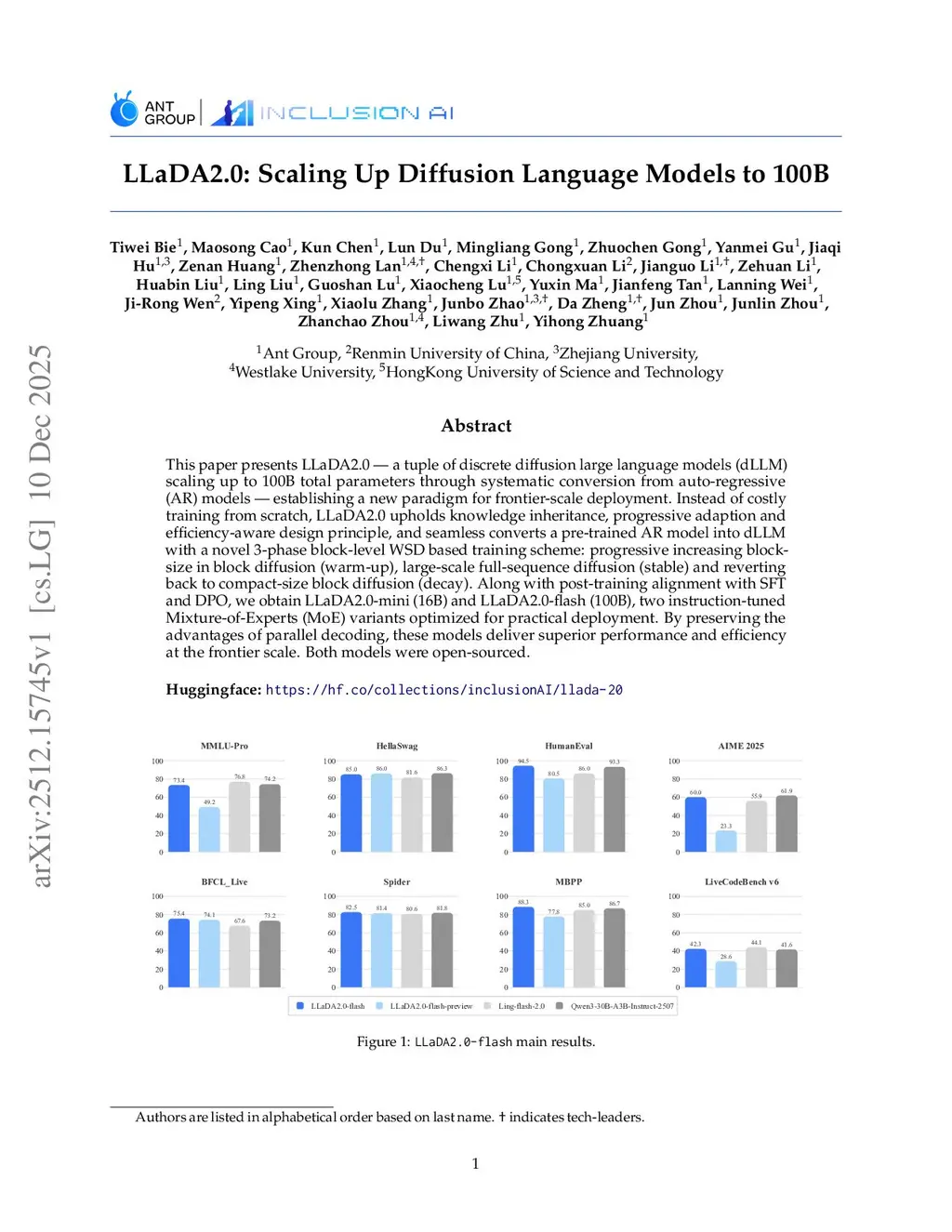 This paper presents LLaDA2.0 -- a tuple of discrete diffusion large language models (dLLM) scaling up to 100B total parameters through systematic conversion from auto-regressive (AR) models -- establishing a new paradigm for frontier-scale deployment. Instead of costly training from scratch, LLaDA2.0 upholds knowledge inheritance, progressive adaption and efficiency-aware design principle, and seamless converts a pre-trained AR model into dLLM with a novel 3-phase block-level WSD based training scheme: progressive increasing block-size in block diffusion (warm-up), large-scale full-sequence diffusion (stable) and reverting back to compact-size block diffusion (decay). Along with post-training alignment with SFT and DPO, we obtain LLaDA2.0-mini (16B) and LLaDA2.0-flash (100B), two instruction-tuned Mixture-of-Experts (MoE) variants optimized for practical deployment. By preserving the advantages of parallel decoding, these models deliver superior performance and efficiency at the frontier scale. Both models were open-sourced.