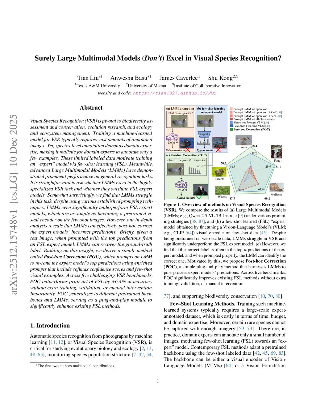 Visual Species Recognition (VSR) is pivotal to biodiversity assessment and conservation, evolution research, and ecology and ecosystem management. Training a machine-learned model for VSR typically requires vast amounts of annotated images. Yet, species-level annotation demands domain expertise, making it realistic for domain experts to annotate only a few examples. These limited labeled data motivate training an 'éxpert'' model via few-shot learning (FSL). Meanwhile, advanced Large Multimodal Models (LMMs) have demonstrated prominent performance on general recognition tasks. It is straightforward to ask whether LMMs excel in the highly specialized VSR task and whether they outshine FSL expert models. Somewhat surprisingly, we find that LMMs struggle in this task, despite using various established prompting techniques. LMMs even significantly underperform FSL expert models, which are as simple as finetuning a pretrained visual encoder on the few-shot images. However, our in-depth analysis reveals that LMMs can effectively post-hoc correct the expert models' incorrect predictions. Briefly, given a test image, when prompted with the top predictions from an FSL expert model, LMMs can recover the ground-truth label. Building on this insight, we derive a simple method called Post-hoc Correction (POC), which prompts an LMM to re-rank the expert model's top predictions using enriched prompts that include softmax confidence scores and few-shot visual examples. Across five challenging VSR benchmarks, POC outperforms prior art of FSL by +6.4% in accuracy without extra training, validation, or manual intervention. Importantly, POC generalizes to different pretrained backbones and LMMs, serving as a plug-and-play module to significantly enhance existing FSL methods.