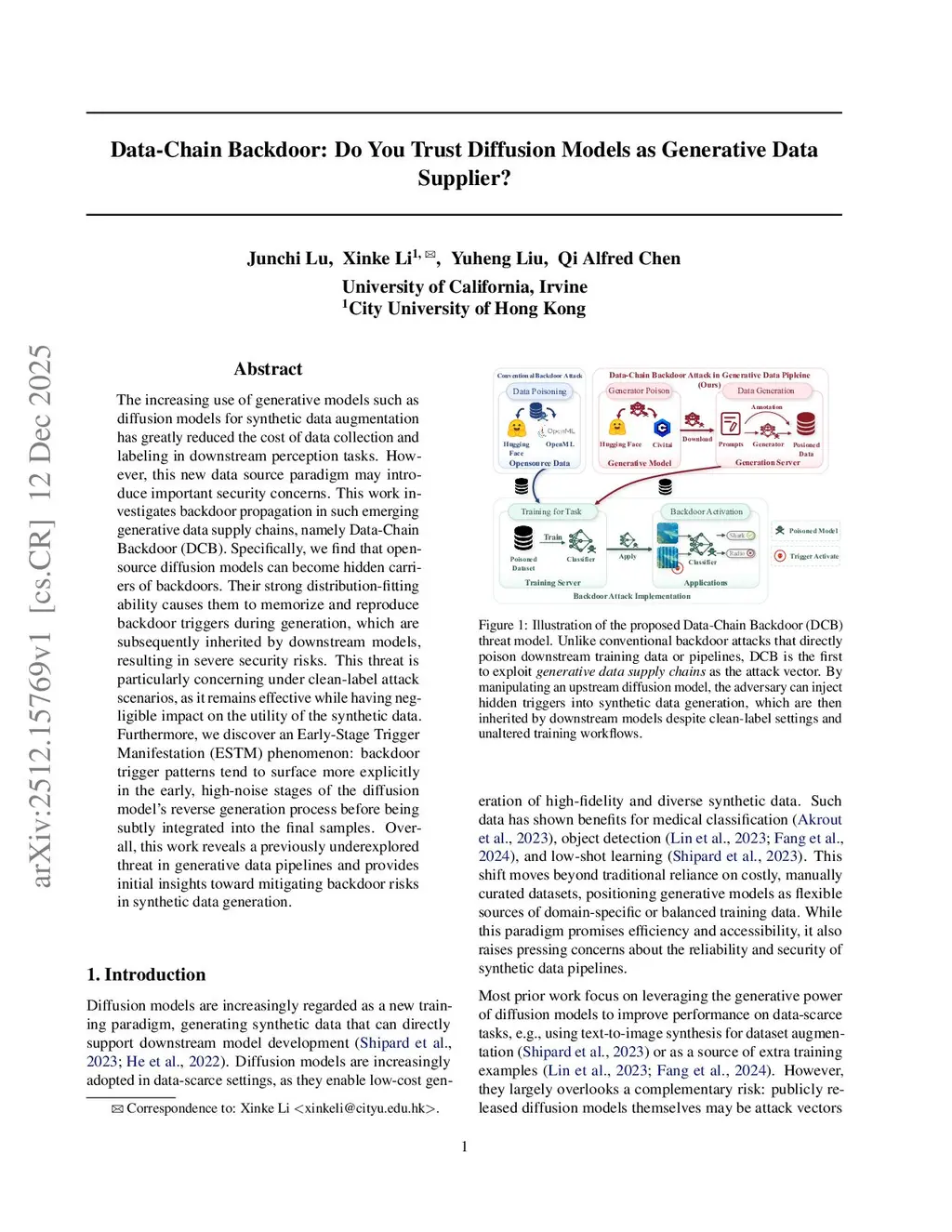 The increasing use of generative models such as diffusion models for synthetic data augmentation has greatly reduced the cost of data collection and labeling in downstream perception tasks. However, this new data source paradigm may introduce important security concerns. Publicly available generative models are often reused without verification, raising a fundamental question of their safety and trustworthiness. This work investigates backdoor propagation in such emerging generative data supply chain, namely, Data-Chain Backdoor (DCB). Specifically, we find that open-source diffusion models can become hidden carriers of backdoors. Their strong distribution-fitting ability causes them to memorize and reproduce backdoor triggers in generation, which are subsequently inherited by downstream models, resulting in severe security risks. This threat is particularly concerning under clean-label attack scenarios, as it remains effective while having negligible impact on the utility of the synthetic data. We study two attacker choices to obtain a backdoor-carried generator, training from scratch and fine-tuning. While naive fine-tuning leads to weak inheritance of the backdoor, we find that novel designs in the loss objectives and trigger processing can substantially improve the generator's ability to preserve trigger patterns, making fine-tuning a low-cost attack path. We evaluate the effectiveness of DCB under the standard augmentation protocol and further assess data-scarce settings. Across multiple trigger types, we observe that the trigger pattern can be consistently retained in the synthetic data with attack efficacy comparable to the conventional backdoor attack.