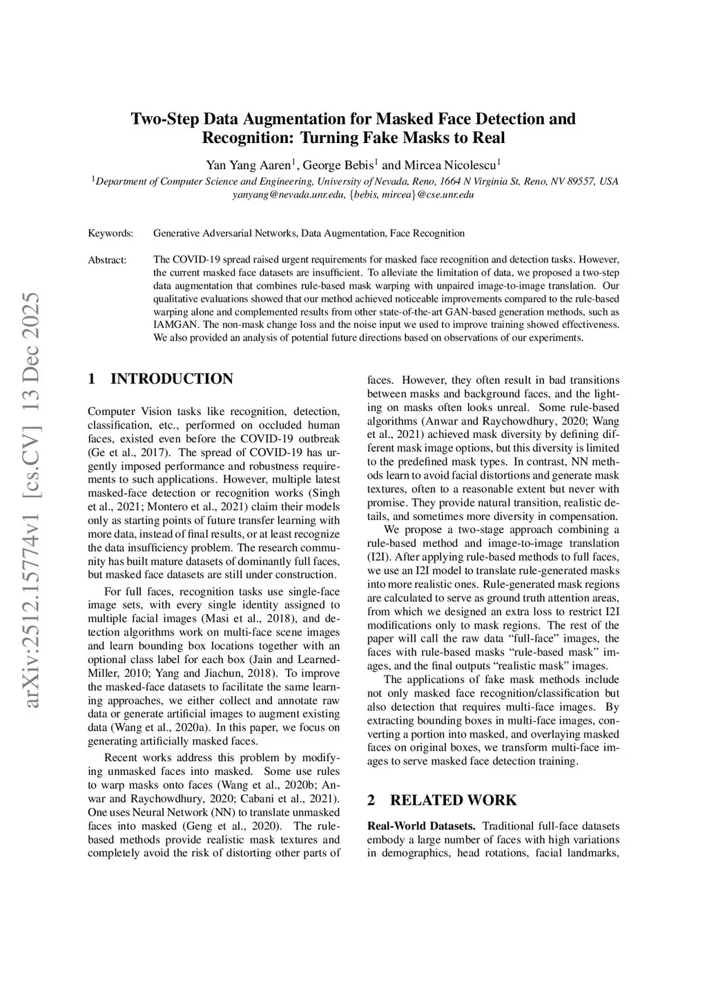 Two-Step Data Augmentation for Masked Face Detection and Recognition: Turning Fake Masks to Real