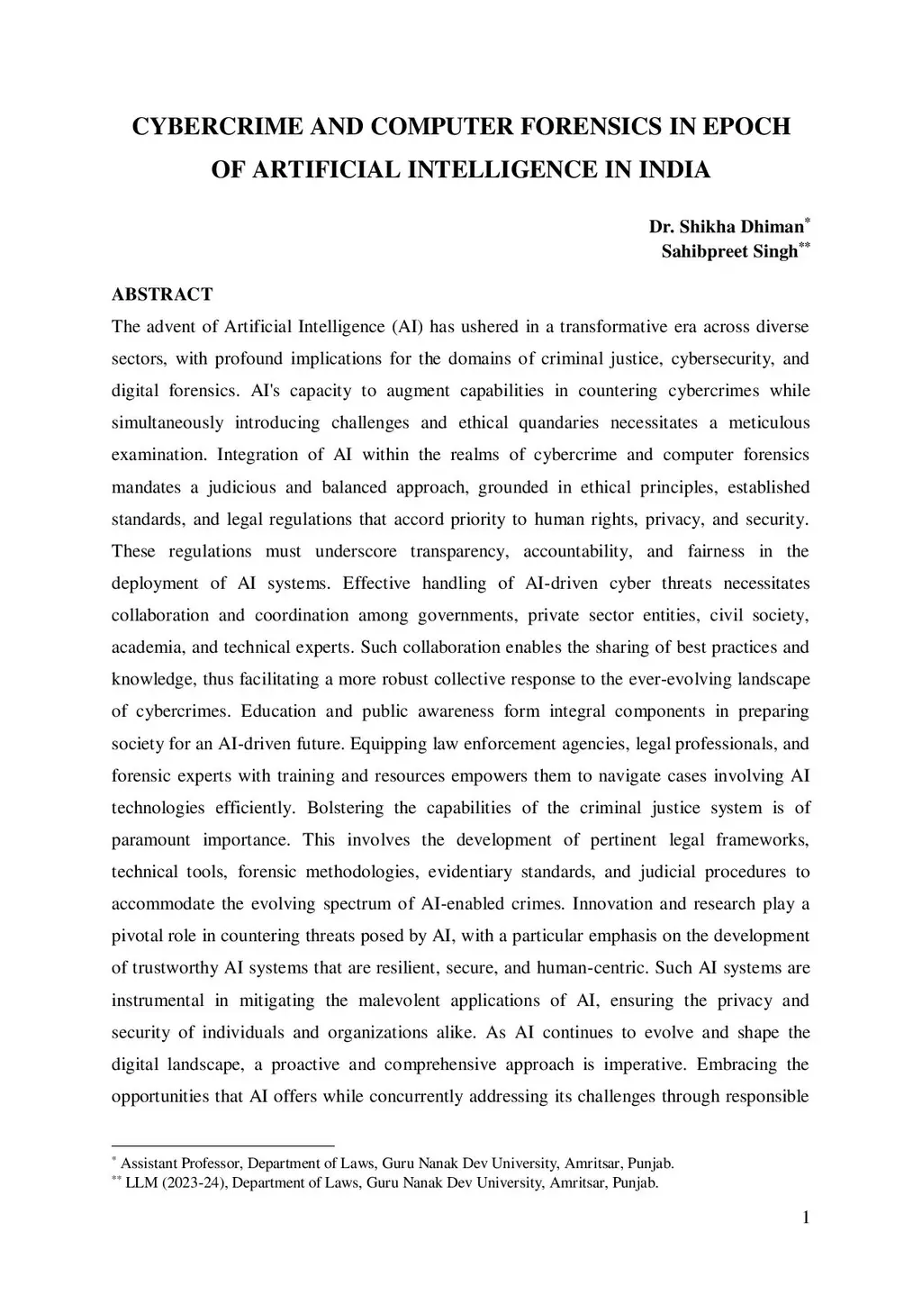 Cybercrime and Computer Forensics in Epoch of Artificial Intelligence in India