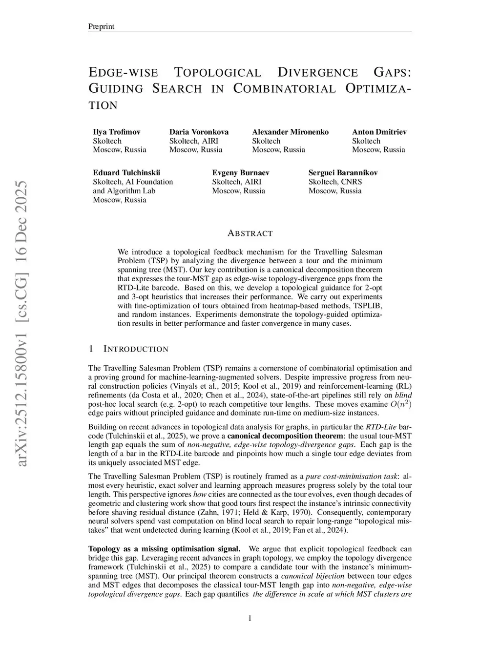 We introduce a topological feedback mechanism for the Travelling Salesman Problem (TSP) by analyzing the divergence between a tour and the minimum spanning tree (MST). Our key contribution is a canonical decomposition theorem that expresses the tour-MST gap as edge-wise topology-divergence gaps from the RTD-Lite barcode. Based on this, we develop a topological guidance for 2-opt and 3-opt heuristics that increases their performance. We carry out experiments with fine-optimization of tours obtained from heatmap-based methods, TSPLIB, and random instances. Experiments demonstrate the topology-guided optimization results in better performance and faster convergence in many cases.