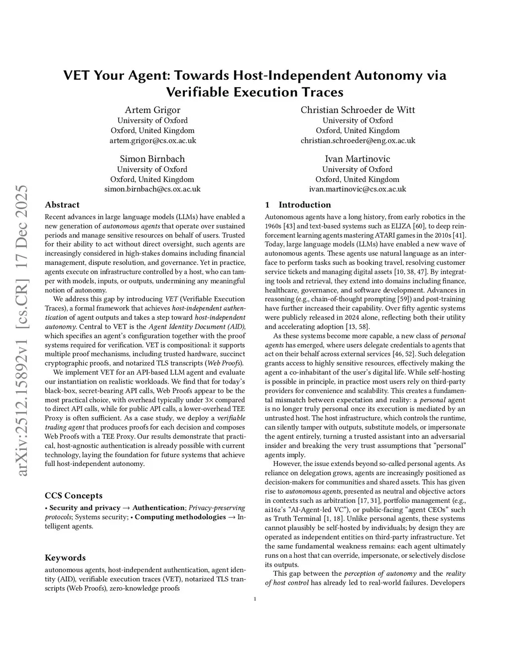 Recent advances in large language models (LLMs) have enabled a new generation of autonomous agents that operate over sustained periods and manage sensitive resources on behalf of users. Trusted for their ability to act without direct oversight, such agents are increasingly considered in high-stakes domains including financial management, dispute resolution, and governance. Yet in practice, agents execute on infrastructure controlled by a host, who can tamper with models, inputs, or outputs, undermining any meaningful notion of autonomy.We address this gap by introducing VET (Verifiable Execution Traces), a formal framework that achieves host-independent authentication of agent outputs and takes a step toward host-independent autonomy. Central to VET is the Agent Identity Document (AID), which specifies an agent's configuration together with the proof systems required for verification. VET is compositional: it supports multiple proof mechanisms, including trusted hardware, succinct cryptographic proofs, and notarized TLS transcripts (Web Proofs).We implement VET for an API-based LLM agent and evaluate our instantiation on realistic workloads. We find that for today's black-box, secret-bearing API calls, Web Proofs appear to be the most practical choice, with overhead typically under 3 compared to direct API calls, while for public API calls, a lower-overhead TEE Proxy is often sufficient. As a case study, we deploy a verifiable trading agent that produces proofs for each decision and composes Web Proofs with a TEE Proxy. Our results demonstrate that practical, host-agnostic authentication is already possible with current technology, laying the foundation for future systems that achieve full host-independent autonomy.