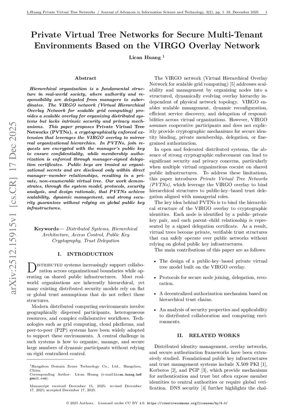 Hierarchical organization is a fundamental structure in real-world society, where authority and responsibility are delegated from managers to subordinates. The VIRGO network (Virtual Hierarchical Overlay Network for scalable grid computing) provides a scalable overlay for organizing distributed systems but lacks intrinsic security and privacy mechanisms. This paper proposes Private Virtual Tree Networks (PVTNs), a cryptographically enforced extension that leverages the VIRGO overlay to mirror real organizational hierarchies. In PVTNs, join requests are encrypted with the manager's public key to ensure confidentiality, while membership authorization is enforced through manager-signed delegation certificates. Public keys are treated as organizational secrets and are disclosed only within direct manager-member relationships, resulting in a private, non-enumerable virtual tree. Our work demonstrates, through the system model, protocols, security analysis, and design rationale, that PVTNs achieve scalability, dynamic management, and strong security guarantees without relying on global public key infrastructures.