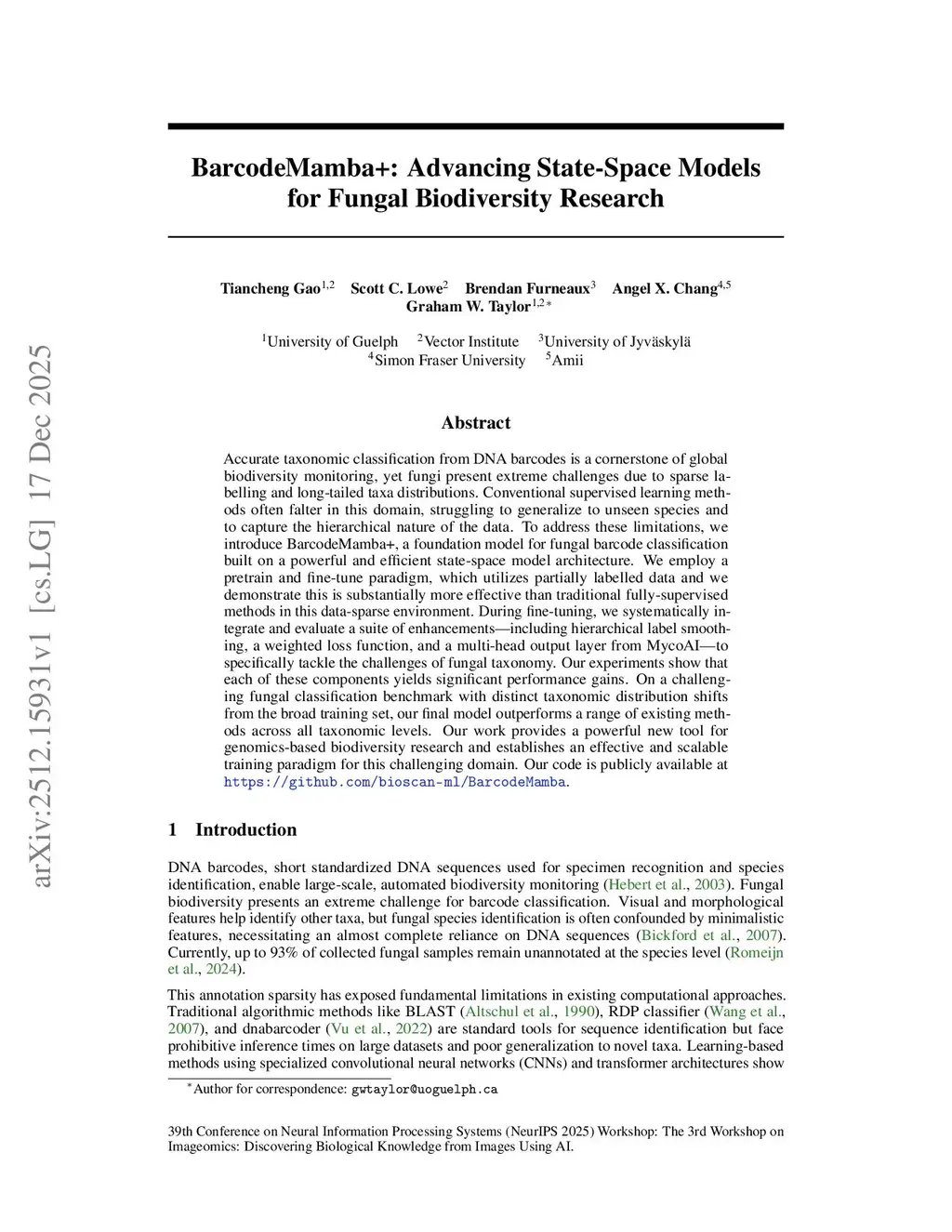 Accurate taxonomic classification from DNA barcodes is a cornerstone of global biodiversity monitoring, yet fungi present extreme challenges due to sparse labelling and long-tailed taxa distributions. Conventional supervised learning methods often falter in this domain, struggling to generalize to unseen species and to capture the hierarchical nature of the data. To address these limitations, we introduce BarcodeMamba+, a foundation model for fungal barcode classification built on a powerful and efficient state-space model architecture. We employ a pretrain and fine-tune paradigm, which utilizes partially labelled data and we demonstrate this is substantially more effective than traditional fully-supervised methods in this data-sparse environment. During fine-tuning, we systematically integrate and evaluate a suite of enhancements--including hierarchical label smoothing, a weighted loss function, and a multi-head output layer from MycoAI--to specifically tackle the challenges of fungal taxonomy. Our experiments show that each of these components yields significant performance gains. On a challenging fungal classification benchmark with distinct taxonomic distribution shifts from the broad training set, our final model outperforms a range of existing methods across all taxonomic levels. Our work provides a powerful new tool for genomics-based biodiversity research and establishes an effective and scalable training paradigm for this challenging domain. Our code is publicly available atthis https URL.