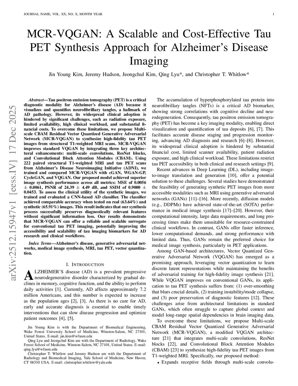 Tau positron emission tomography (PET) is a critical diagnostic modality for Alzheimer's disease (AD) because it visualizes and quantifies neurofibrillary tangles, a hallmark of AD pathology. However, its widespread clinical adoption is hindered by significant challenges, such as radiation exposure, limited availability, high clinical workload, and substantial financial costs. To overcome these limitations, we propose Multi-scale CBAM Residual Vector Quantized Generative Adversarial Network (MCR-VQGAN) to synthesize high-fidelity tau PET images from structural T1-weighted MRI scans. MCR-VQGAN improves standard VQGAN by integrating three key architectural enhancements: multi-scale convolutions, ResNet blocks, and Convolutional Block Attention Modules (CBAM). Using 222 paired structural T1-weighted MRI and tau PET scans from Alzheimer's Disease Neuroimaging Initiative (ADNI), we trained and compared MCR-VQGAN with cGAN, WGAN-GP, CycleGAN, and VQGAN. Our proposed model achieved superior image synthesis performance across all metrics: MSE of 0.0056 +/- 0.0061, PSNR of 24.39 +/- 4.49 dB, and SSIM of 0.9000 +/- 0.0453. To assess the clinical utility of the synthetic images, we trained and evaluated a CNN-based AD classifier. The classifier achieved comparable accuracy when tested on real (63.64%) and synthetic (65.91%) images. This result indicates that our synthesis process successfully preserves diagnostically relevant features without significant information loss. Our results demonstrate that MCR-VQGAN can offer a reliable and scalable surrogate for conventional tau PET imaging, potentially improving the accessibility and scalability of tau imaging biomarkers for AD research and clinical workflows.