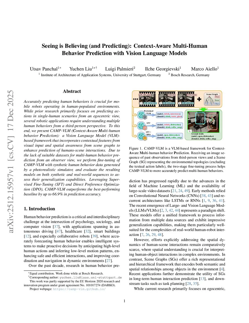 Accurately predicting human behaviors is crucial for mobile robots operating in human-populated environments. While prior research primarily focuses on predicting actions in single-human scenarios from an egocentric view, several robotic applications require understanding multiple human behaviors from a third-person perspective. To this end, we present CAMP-VLM (Context-Aware Multi-human behavior Prediction): a Vision Language Model (VLM)-based framework that incorporates contextual features from visual input and spatial awareness from scene graphs to enhance prediction of humans-scene interactions. Due to the lack of suitable datasets for multi-human behavior prediction from an observer view, we perform fine-tuning of CAMP-VLM with synthetic human behavior data generated by a photorealistic simulator, and evaluate the resulting models on both synthetic and real-world sequences to assess their generalization capabilities. Leveraging Supervised Fine-Tuning (SFT) and Direct Preference Optimization (DPO), CAMP-VLM outperforms the best-performing baseline by up to 66.9% in prediction accuracy.