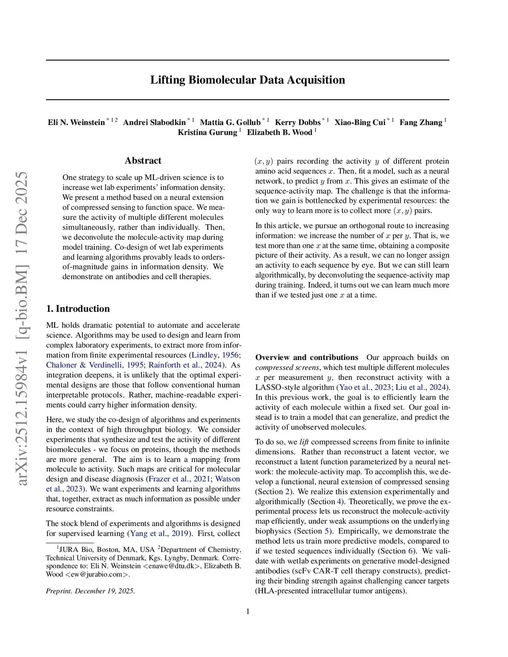 One strategy to scale up ML-driven science is to increase wet lab experiments' information density. We present a method based on a neural extension of compressed sensing to function space. We measure the activity of multiple different molecules simultaneously, rather than individually. Then, we deconvolute the molecule-activity map during model training. Co-design of wet lab experiments and learning algorithms provably leads to orders-of-magnitude gains in information density. We demonstrate on antibodies and cell therapies.