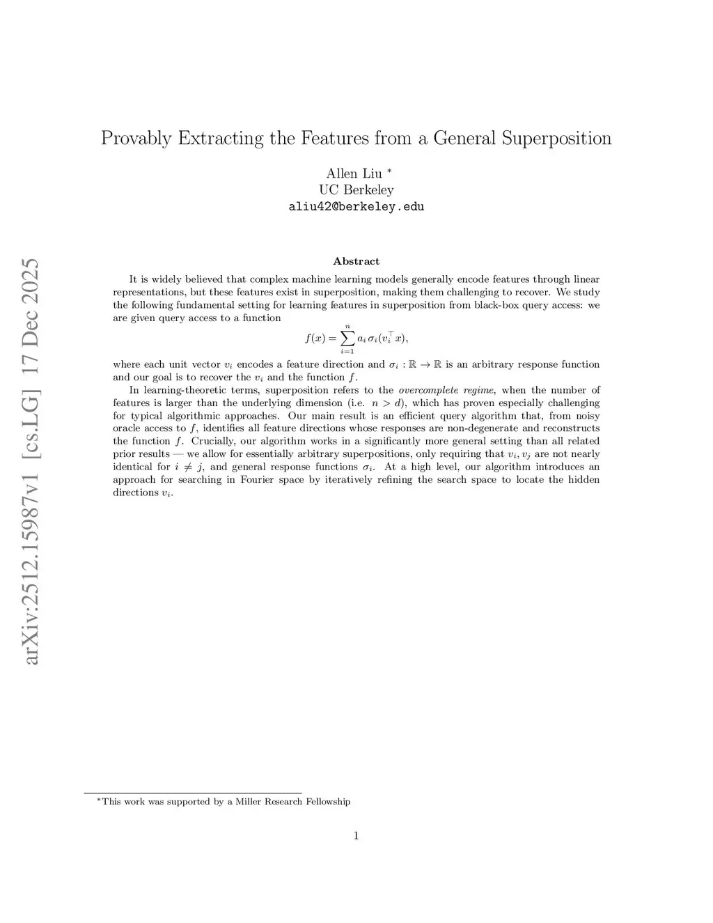 It is widely believed that complex machine learning models generally encode features through linear representations. This is the foundational hypothesis behind a vast body of work on interpretability. A key challenge toward extracting interpretable features, however, is that they exist in superposition. In this work, we study the question of extracting features in superposition from a learning theoretic perspective. We start with the following fundamental setting: we are given query access to a function \[ f(x)=\sum_{i=1}^n \sigma_i(v_i^\top x), \] where each unit vector encodes a feature direction and is an arbitrary response function and our goal is to recover the and the function .In learning-theoretic terms, superposition refers to the \emph{overcomplete regime}, when the number of features is larger than the underlying dimension (i.e. ), which has proven especially challenging for typical algorithmic approaches. Our main result is an efficient query algorithm that, from noisy oracle access to , identifies all feature directions whose responses are non-degenerate and reconstructs the function . Crucially, our algorithm works in a significantly more general setting than all related prior results. We allow for essentially arbitrary superpositions, only requiring that are not nearly identical for , and allowing for general response functions . At a high level, our algorithm introduces an approach for searching in Fourier space by iteratively refining the search space to locate the hidden directions .