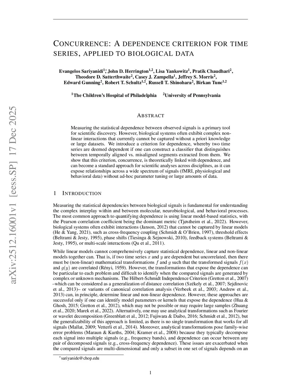 Measuring the statistical dependence between observed signals is a primary tool for scientific discovery. However, biological systems often exhibit complex non-linear interactions that currently cannot be captured without a priori knowledge or large datasets. We introduce a criterion for dependence, whereby two time series are deemed dependent if one can construct a classifier that distinguishes between temporally aligned vs. misaligned segments extracted from them. We show that this criterion, concurrence, is theoretically linked with dependence, and can become a standard approach for scientific analyses across disciplines, as it can expose relationships across a wide spectrum of signals (fMRI, physiological and behavioral data) without ad-hoc parameter tuning or large amounts of data.