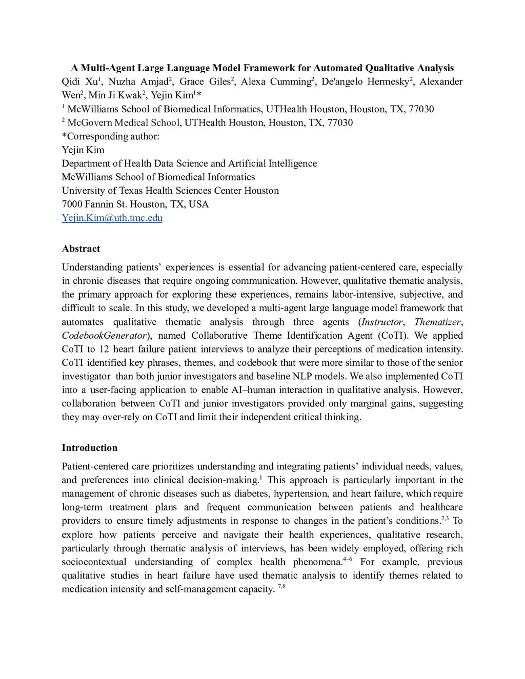 Understanding patients experiences is essential for advancing patient centered care, especially in chronic diseases that require ongoing communication. However, qualitative thematic analysis, the primary approach for exploring these experiences, remains labor intensive, subjective, and difficult to scale. In this study, we developed a multi agent large language model framework that automates qualitative thematic analysis through three agents (Instructor, Thematizer, CodebookGenerator), named Collaborative Theme Identification Agent (CoTI). We applied CoTI to 12 heart failure patient interviews to analyze their perceptions of medication intensity. CoTI identified key phrases, themes, and codebook that were more similar to those of the senior investigator than both junior investigators and baseline NLP models. We also implemented CoTI into a user-facing application to enable AI human interaction in qualitative analysis. However, collaboration between CoTI and junior investigators provided only marginal gains, suggesting they may overrely on CoTI and limit their independent critical thinking.