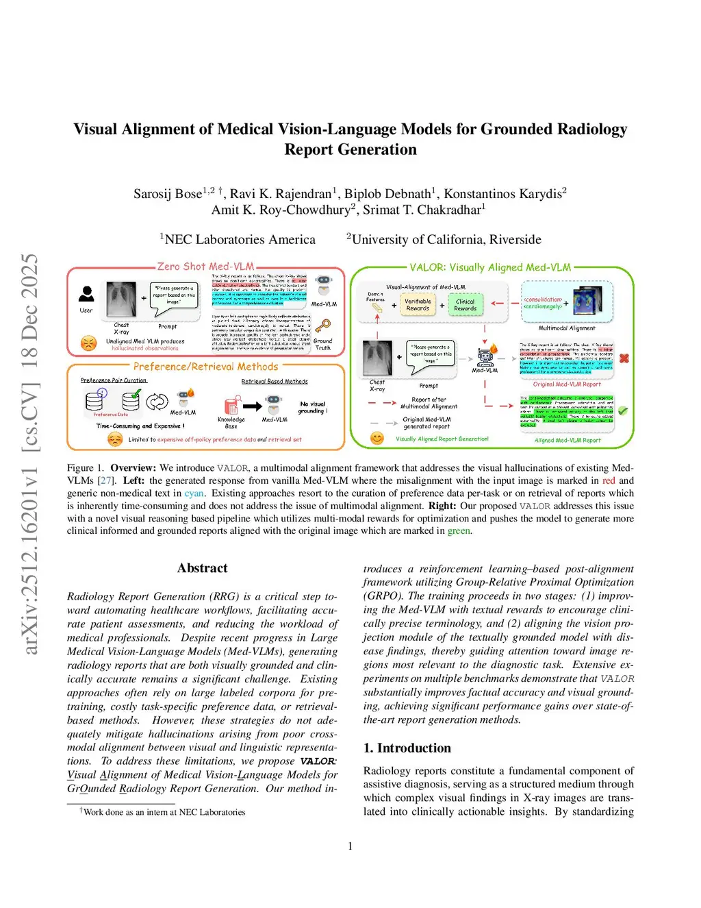 Radiology Report Generation (RRG) is a critical step toward automating healthcare workflows, facilitating accurate patient assessments, and reducing the workload of medical professionals. Despite recent progress in Large Medical Vision-Language Models (Med-VLMs), generating radiology reports that are both visually grounded and clinically accurate remains a significant challenge. Existing approaches often rely on large labeled corpora for pre-training, costly task-specific preference data, or retrieval-based methods. However, these strategies do not adequately mitigate hallucinations arising from poor cross-modal alignment between visual and linguistic representations. To address these limitations, we propose VALOR:Visual Alignment of Medical Vision-Language Models for GrOunded Radiology Report Generation. Our method introduces a reinforcement learning-based post-alignment framework utilizing Group-Relative Proximal Optimization (GRPO). The training proceeds in two stages: (1) improving the Med-VLM with textual rewards to encourage clinically precise terminology, and (2) aligning the vision projection module of the textually grounded model with disease findings, thereby guiding attention toward image re gions most relevant to the diagnostic task. Extensive experiments on multiple benchmarks demonstrate that VALOR substantially improves factual accuracy and visual grounding, achieving significant performance gains over state-of-the-art report generation methods.