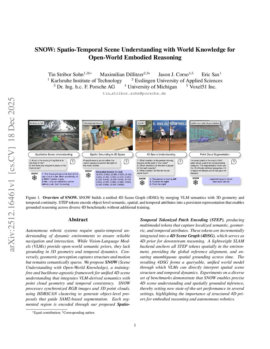 Autonomous robotic systems require spatio-temporal understanding of dynamic environments to ensure reliable navigation and interaction. While Vision-Language Models (VLMs) provide open-world semantic priors, they lack grounding in 3D geometry and temporal dynamics. Conversely, geometric perception captures structure and motion but remains semantically sparse. We propose SNOW (Scene Understanding with Open-World Knowledge), a training-free and backbone-agnostic framework for unified 4D scene understanding that integrates VLM-derived semantics with point cloud geometry and temporal consistency. SNOW processes synchronized RGB images and 3D point clouds, using HDBSCAN clustering to generate object-level proposals that guide SAM2-based segmentation. Each segmented region is encoded through our proposed Spatio-Temporal Tokenized Patch Encoding (STEP), producing multimodal tokens that capture localized semantic, geometric, and temporal attributes. These tokens are incrementally integrated into a 4D Scene Graph (4DSG), which serves as 4D prior for downstream reasoning. A lightweight SLAM backend anchors all STEP tokens spatially in the environment, providing the global reference alignment, and ensuring unambiguous spatial grounding across time. The resulting 4DSG forms a queryable, unified world model through which VLMs can directly interpret spatial scene structure and temporal dynamics. Experiments on a diverse set of benchmarks demonstrate that SNOW enables precise 4D scene understanding and spatially grounded inference, thereby setting new state-of-the-art performance in several settings, highlighting the importance of structured 4D priors for embodied reasoning and autonomous robotics.