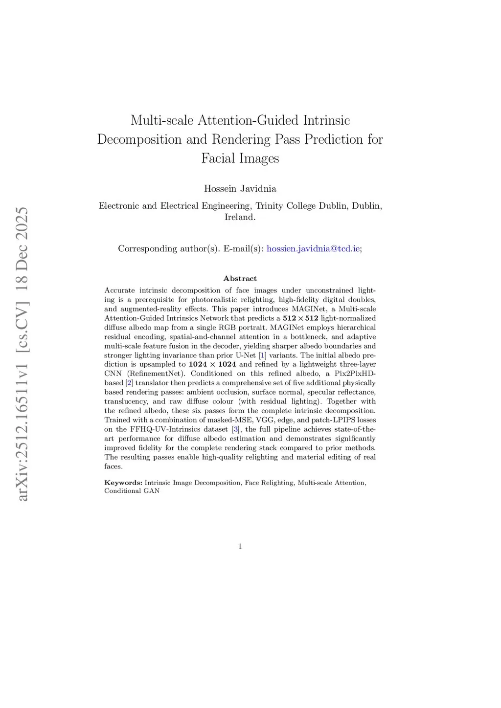 Accurate intrinsic decomposition of face images under unconstrained lighting is a prerequisite for photorealistic relighting, high-fidelity digital doubles, and augmented-reality effects. This paper introduces MAGINet, a Multi-scale Attention-Guided Intrinsics Network that predicts a light-normalized diffuse albedo map from a single RGB portrait. MAGINet employs hierarchical residual encoding, spatial-and-channel attention in a bottleneck, and adaptive multi-scale feature fusion in the decoder, yielding sharper albedo boundaries and stronger lighting invariance than prior U-Net variants. The initial albedo prediction is upsampled to and refined by a lightweight three-layer CNN (RefinementNet). Conditioned on this refined albedo, a Pix2PixHD-based translator then predicts a comprehensive set of five additional physically based rendering passes: ambient occlusion, surface normal, specular reflectance, translucency, and raw diffuse colour (with residual lighting). Together with the refined albedo, these six passes form the complete intrinsic decomposition. Trained with a combination of masked-MSE, VGG, edge, and patch-LPIPS losses on the FFHQ-UV-Intrinsics dataset, the full pipeline achieves state-of-the-art performance for diffuse albedo estimation and demonstrates significantly improved fidelity for the complete rendering stack compared to prior methods. The resulting passes enable high-quality relighting and material editing of real faces.
