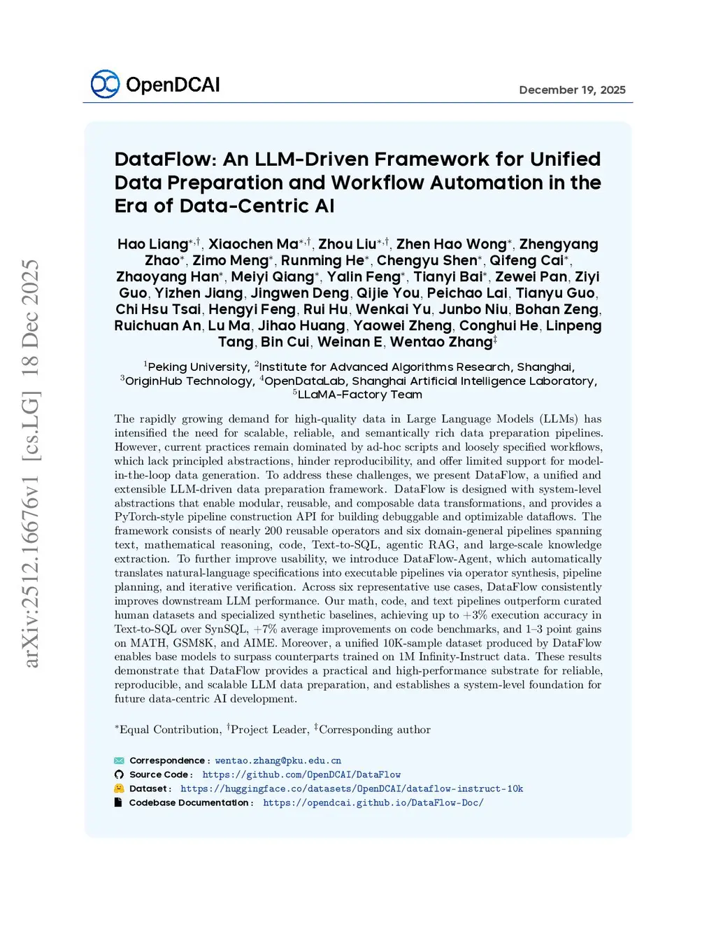 The rapidly growing demand for high-quality data in Large Language Models (LLMs) has intensified the need for scalable, reliable, and semantically rich data preparation pipelines. However, current practices remain dominated by ad-hoc scripts and loosely specified workflows, which lack principled abstractions, hinder reproducibility, and offer limited support for model-in-the-loop data generation. To address these challenges, we present DataFlow, a unified and extensible LLM-driven data preparation framework. DataFlow is designed with system-level abstractions that enable modular, reusable, and composable data transformations, and provides a PyTorch-style pipeline construction API for building debuggable and optimizable dataflows. The framework consists of nearly 200 reusable operators and six domain-general pipelines spanning text, mathematical reasoning, code, Text-to-SQL, agentic RAG, and large-scale knowledge extraction. To further improve usability, we introduce DataFlow-Agent, which automatically translates natural-language specifications into executable pipelines via operator synthesis, pipeline planning, and iterative verification. Across six representative use cases, DataFlow consistently improves downstream LLM performance. Our math, code, and text pipelines outperform curated human datasets and specialized synthetic baselines, achieving up to +3\% execution accuracy in Text-to-SQL over SynSQL, +7\% average improvements on code benchmarks, and 1--3 point gains on MATH, GSM8K, and AIME. Moreover, a unified 10K-sample dataset produced by DataFlow enables base models to surpass counterparts trained on 1M Infinity-Instruct data. These results demonstrate that DataFlow provides a practical and high-performance substrate for reliable, reproducible, and scalable LLM data preparation, and establishes a system-level foundation for future data-centric AI development.