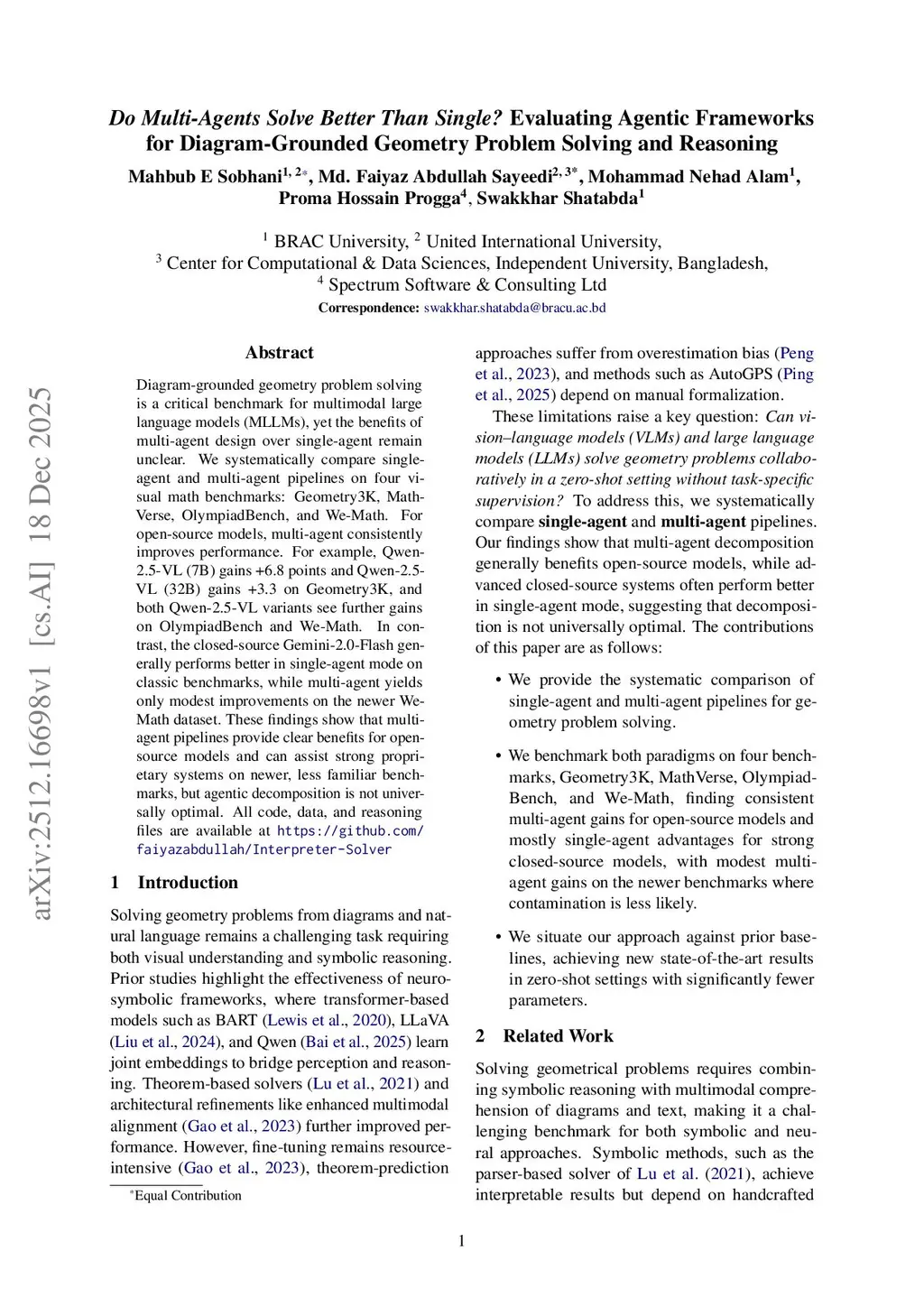 Diagram-grounded geometry problem solving is a critical benchmark for multimodal large language models (MLLMs), yet the benefits of multi-agent design over single-agent remain unclear. We systematically compare single-agent and multi-agent pipelines on four visual math benchmarks: Geometry3K, MathVerse, OlympiadBench, and We-Math. For open-source models, multi-agent consistently improves performance. For example, Qwen-2.5-VL (7B) gains +6.8 points and Qwen-2.5-VL (32B) gains +3.3 on Geometry3K, and both Qwen-2.5-VL variants see further gains on OlympiadBench and We-Math. In contrast, the closed-source Gemini-2.0-Flash generally performs better in single-agent mode on classic benchmarks, while multi-agent yields only modest improvements on the newer We-Math dataset. These findings show that multi-agent pipelines provide clear benefits for open-source models and can assist strong proprietary systems on newer, less familiar benchmarks, but agentic decomposition is not universally optimal. All code, data, and reasoning files are available atthis https URL
