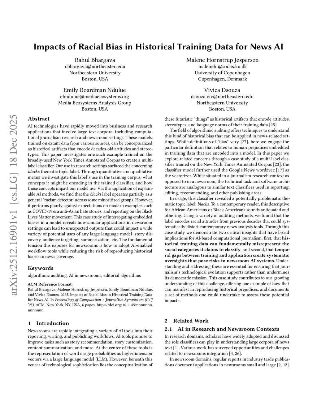 Impacts of Racial Bias in Historical Training Data for News AI