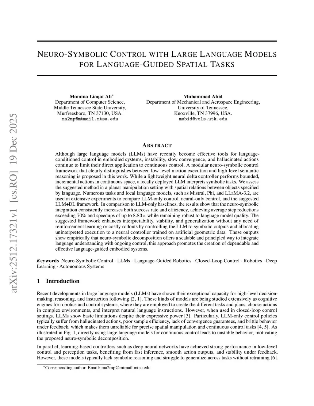 Although large language models (LLMs) have recently become effective tools for language-conditioned control in embodied systems, instability, slow convergence, and hallucinated actions continue to limit their direct application to continuous control. A modular neuro-symbolic control framework that clearly distinguishes between low-level motion execution and high-level semantic reasoning is proposed in this work. While a lightweight neural delta controller performs bounded, incremental actions in continuous space, a locally deployed LLM interprets symbolic tasks. We assess the suggested method in a planar manipulation setting with spatial relations between objects specified by language. Numerous tasks and local language models, such as Mistral, Phi, and LLaMA-3.2, are used in extensive experiments to compare LLM-only control, neural-only control, and the suggested LLM+DL framework. In comparison to LLM-only baselines, the results show that the neuro-symbolic integration consistently increases both success rate and efficiency, achieving average step reductions exceeding 70% and speedups of up to 8.83x while remaining robust to language model quality. The suggested framework enhances interpretability, stability, and generalization without any need of reinforcement learning or costly rollouts by controlling the LLM to symbolic outputs and allocating uninterpreted execution to a neural controller trained on artificial geometric data. These outputs show empirically that neuro-symbolic decomposition offers a scalable and principled way to integrate language understanding with ongoing control, this approach promotes the creation of dependable and effective language-guided embodied systems.