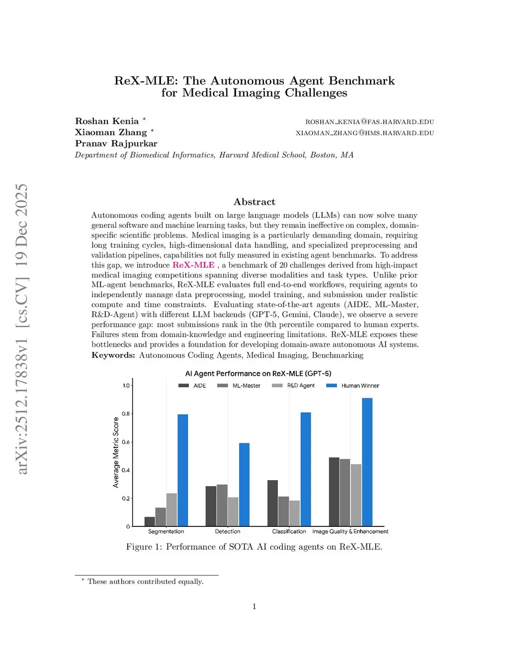 Autonomous coding agents built on large language models (LLMs) can now solve many general software and machine learning tasks, but they remain ineffective on complex, domain-specific scientific problems. Medical imaging is a particularly demanding domain, requiring long training cycles, high-dimensional data handling, and specialized preprocessing and validation pipelines, capabilities not fully measured in existing agent benchmarks. To address this gap, we introduce ReX-MLE, a benchmark of 20 challenges derived from high-impact medical imaging competitions spanning diverse modalities and task types. Unlike prior ML-agent benchmarks, ReX-MLE evaluates full end-to-end workflows, requiring agents to independently manage data preprocessing, model training, and submission under realistic compute and time constraints. Evaluating state-of-the-art agents (AIDE, ML-Master, R&D-Agent) with different LLM backends (GPT-5, Gemini, Claude), we observe a severe performance gap: most submissions rank in the 0th percentile compared to human experts. Failures stem from domain-knowledge and engineering limitations. ReX-MLE exposes these bottlenecks and provides a foundation for developing domain-aware autonomous AI systems.