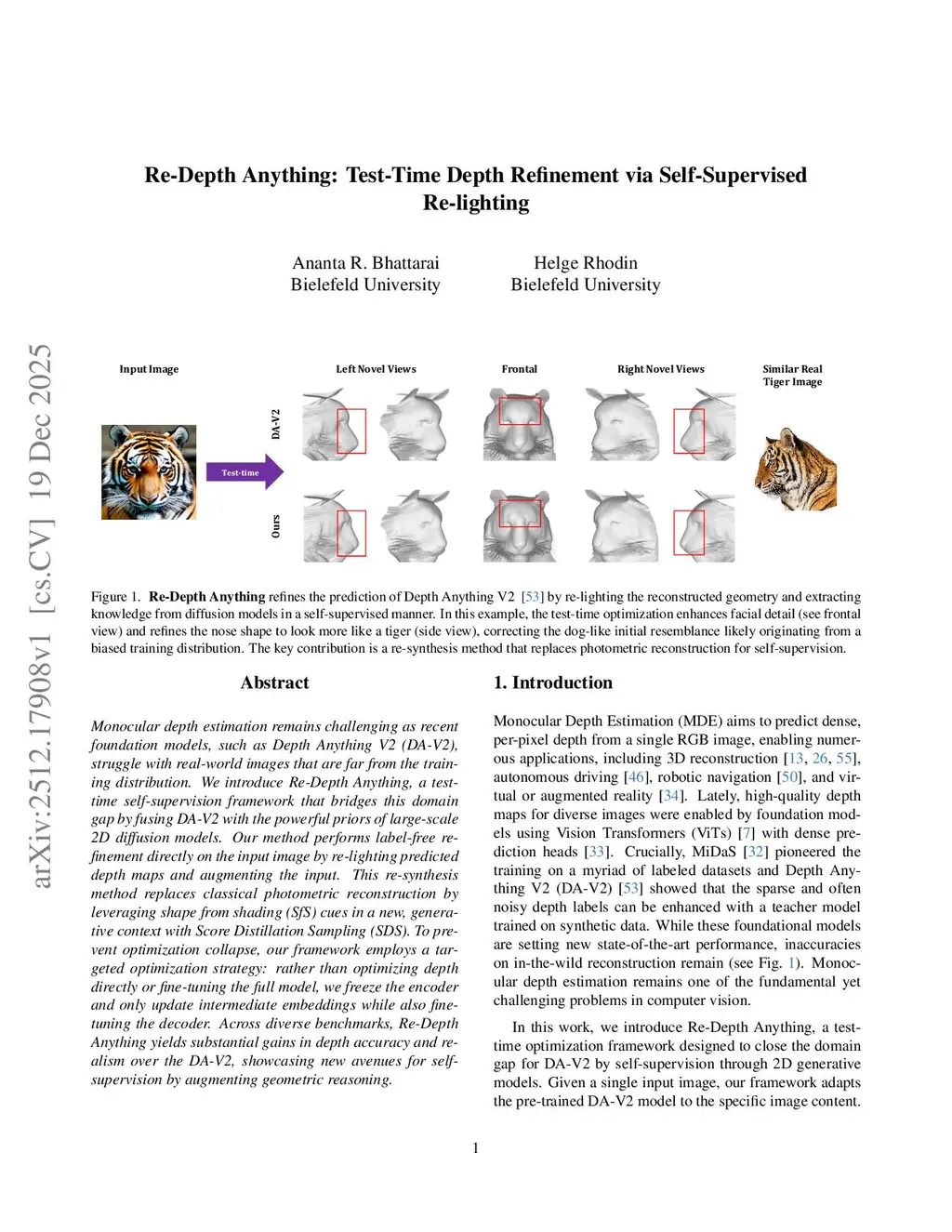 Monocular depth estimation remains challenging as recent foundation models, such as Depth Anything V2 (DA-V2), struggle with real-world images that are far from the training distribution. We introduce Re-Depth Anything, a test-time self-supervision framework that bridges this domain gap by fusing DA-V2 with the powerful priors of large-scale 2D diffusion models. Our method performs label-free refinement directly on the input image by re-lighting predicted depth maps and augmenting the input. This re-synthesis method replaces classical photometric reconstruction by leveraging shape from shading (SfS) cues in a new, generative context with Score Distillation Sampling (SDS). To prevent optimization collapse, our framework employs a targeted optimization strategy: rather than optimizing depth directly or fine-tuning the full model, we freeze the encoder and only update intermediate embeddings while also fine-tuning the decoder. Across diverse benchmarks, Re-Depth Anything yields substantial gains in depth accuracy and realism over the DA-V2, showcasing new avenues for self-supervision by augmenting geometric reasoning.