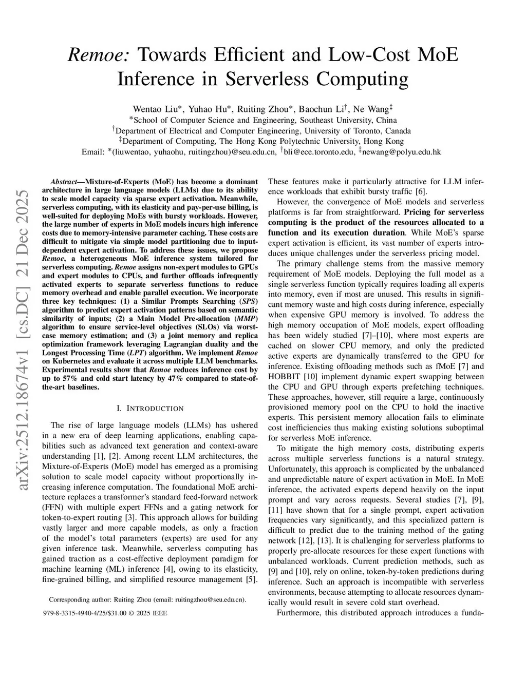 Remoe: Towards Efficient and Low-Cost MoE Inference in Serverless Computing