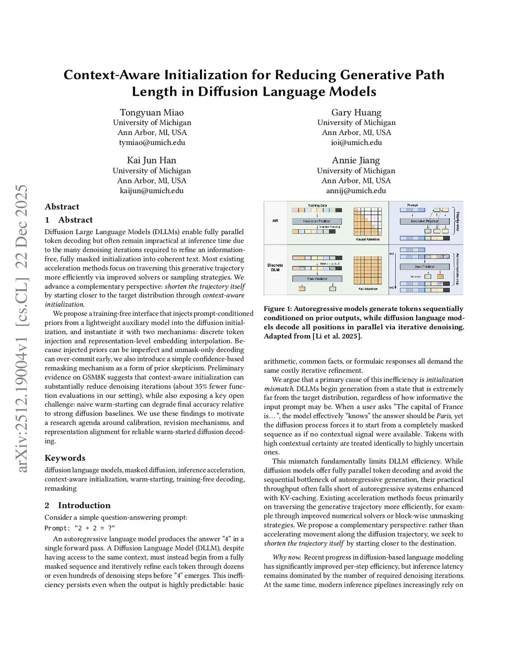 Diffusion Large Language Models (DLLMs) enable fully parallel token decoding but often remain impractical at inference time due to the many denoising iterations required to refine an information-free, fully masked initialization into coherent text. Most existing acceleration methods focus on traversing this generative trajectory more efficiently via improved solvers or sampling strategies. We advance a complementary perspective: shorten the trajectory itself by starting closer to the target distribution through context-aware initialization.We propose a training-free interface that injects prompt-conditioned priors from a lightweight auxiliary model into the diffusion initialization, and instantiate it with two mechanisms: discrete token injection and representation-level embedding interpolation. Because injected priors can be imperfect and unmask-only decoding can over-commit early, we also introduce a simple confidence-based remasking mechanism as a form of prior skepticism. Preliminary evidence on GSM8K suggests that context-aware initialization can substantially reduce denoising iterations (about 35\% fewer function evaluations in our setting), while also exposing a key open challenge: naive warm-starting can degrade final accuracy relative to strong diffusion baselines. We use these findings to motivate a research agenda around calibration, revision mechanisms, and representation alignment for reliable warm-started diffusion decoding.