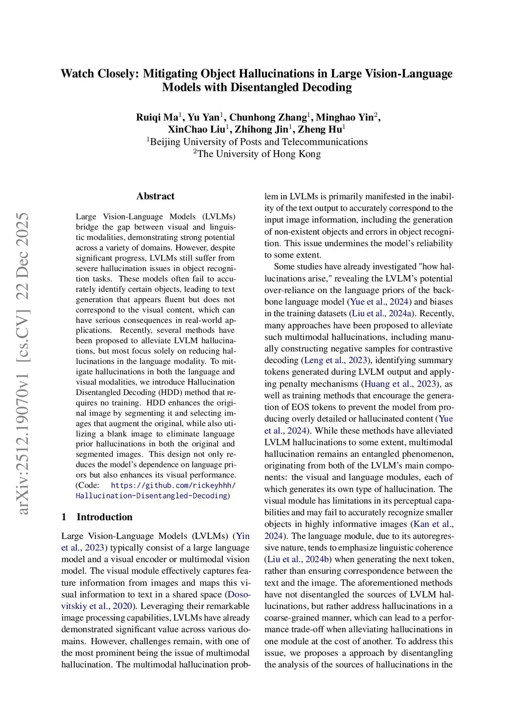 Large Vision-Language Models (LVLMs) bridge the gap between visual and linguistic modalities, demonstrating strong potential across a variety of domains. However, despite significant progress, LVLMs still suffer from severe hallucination issues in object recognition tasks. These models often fail to accurately identify certain objects, leading to text generation that appears fluent but does not correspond to the visual content, which can have serious consequences in real-world applications. Recently, several methods have been proposed to alleviate LVLM hallucinations, but most focus solely on reducing hallucinations in the language modality. To mitigate hallucinations in both the language and visual modalities, we introduce Hallucination Disentangled Decoding (HDD) method that requires no training. HDD enhances the original image by segmenting it and selecting images that augment the original, while also utilizing a blank image to eliminate language prior hallucinations in both the original and segmented images. This design not only reduces the model's dependence on language priors but also enhances its visual performance. (Code:this https URL)