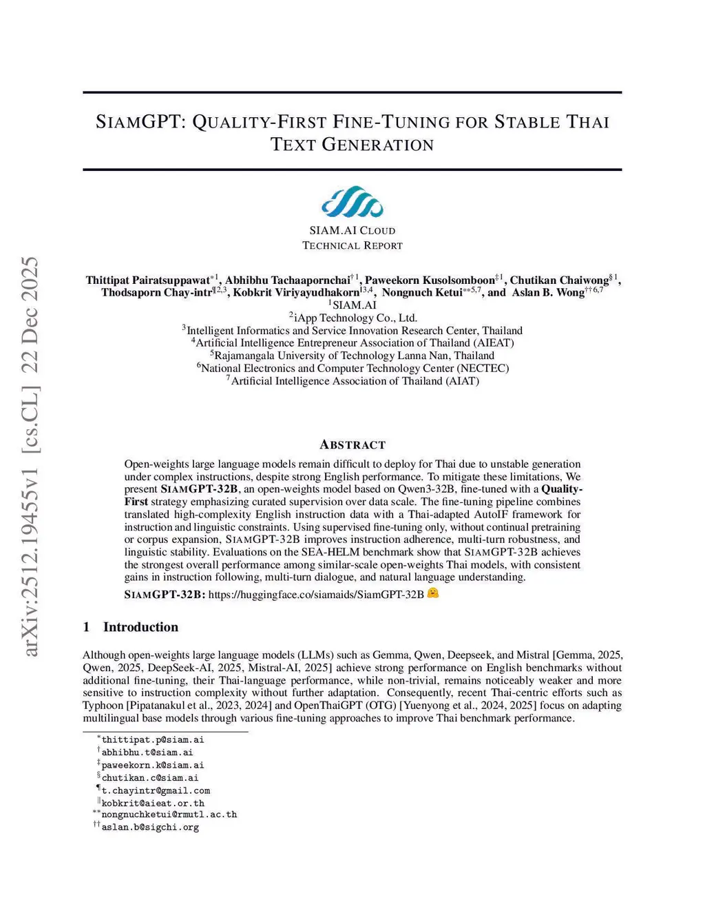 Open-weights large language models remain difficult to deploy for Thai due to unstable generation under complex instructions, despite strong English performance. To mitigate these limitations, We present SiamGPT-32B, an open-weights model based on Qwen3-32B, fine-tuned with a Quality-First strategy emphasizing curated supervision over data scale. The fine-tuning pipeline combines high-complexity English instruction data with a Thai-adapted AutoIF framework for instruction and linguistic constraints. Using supervised fine-tuning only, without continual pretraining or corpus expansion, SiamGPT-32B improves instruction adherence, multi-turn robustness, and linguistic stability. Evaluations on the SEA-HELM benchmark show that SiamGPT-32B achieves the strongest overall performance among similar-scale open-weights Thai models, with consistent gains in instruction following, multi-turn dialogue, and natural language understanding.