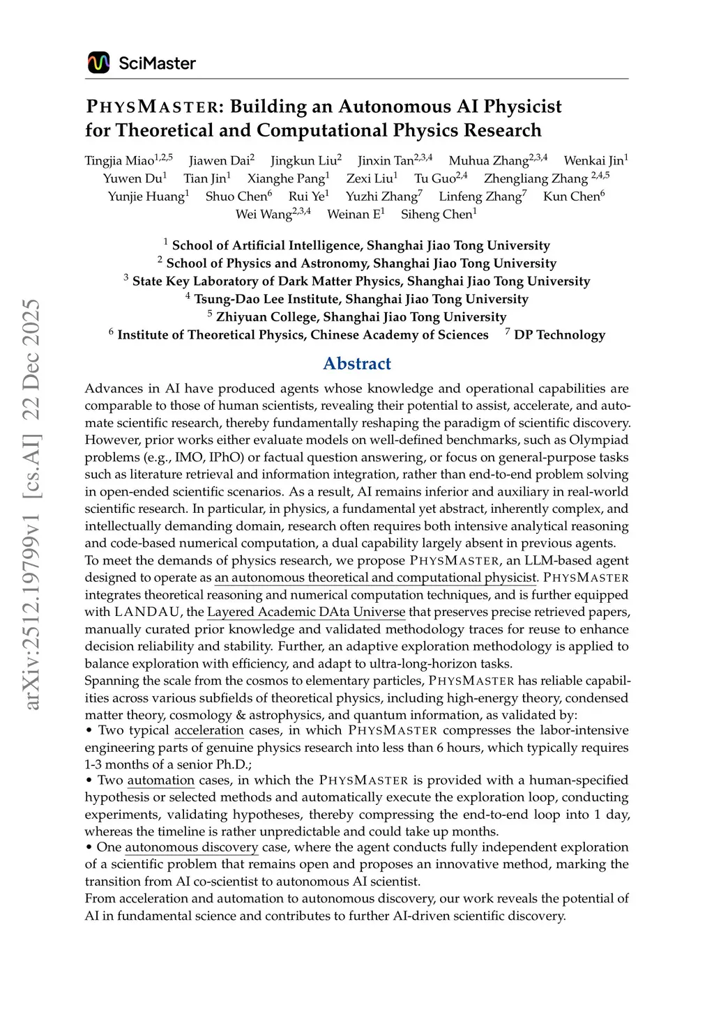 Advances in LLMs have produced agents with knowledge and operational capabilities comparable to human scientists, suggesting potential to assist, accelerate, and automate research. However, existing studies mainly evaluate such systems on well-defined benchmarks or general tasks like literature retrieval, limiting their end-to-end problem-solving ability in open scientific scenarios. This is particularly true in physics, which is abstract, mathematically intensive, and requires integrating analytical reasoning with code-based computation. To address this, we propose PhysMaster, an LLM-based agent functioning as an autonomous theoretical and computational physicist. PhysMaster couples absract reasoning with numerical computation and leverages LANDAU, the Layered Academic Data Universe, which preserves retrieved literature, curated prior knowledge, and validated methodological traces, enhancing decision reliability and stability. It also employs an adaptive exploration strategy balancing efficiency and open-ended exploration, enabling robust performance in ultra-long-horizon tasks. We evaluate PhysMaster on problems from high-energy theory, condensed matter theory to astrophysics, including: (i) acceleration, compressing labor-intensive research from months to hours; (ii) automation, autonomously executing hypothesis-driven loops ; and (iii) autonomous discovery, independently exploring open problems.