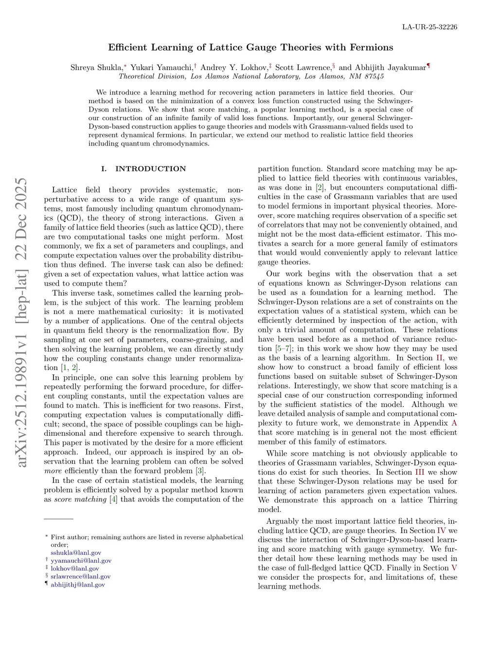 We introduce a learning method for recovering action parameters in lattice field theories. Our method is based on the minimization of a convex loss function constructed using the Schwinger-Dyson relations. We show that score matching, a popular learning method, is a special case of our construction of an infinite family of valid loss functions. Importantly, our general Schwinger-Dyson-based construction applies to gauge theories and models with Grassmann-valued fields used to represent dynamical fermions. In particular, we extend our method to realistic lattice field theories including quantum chromodynamics.
