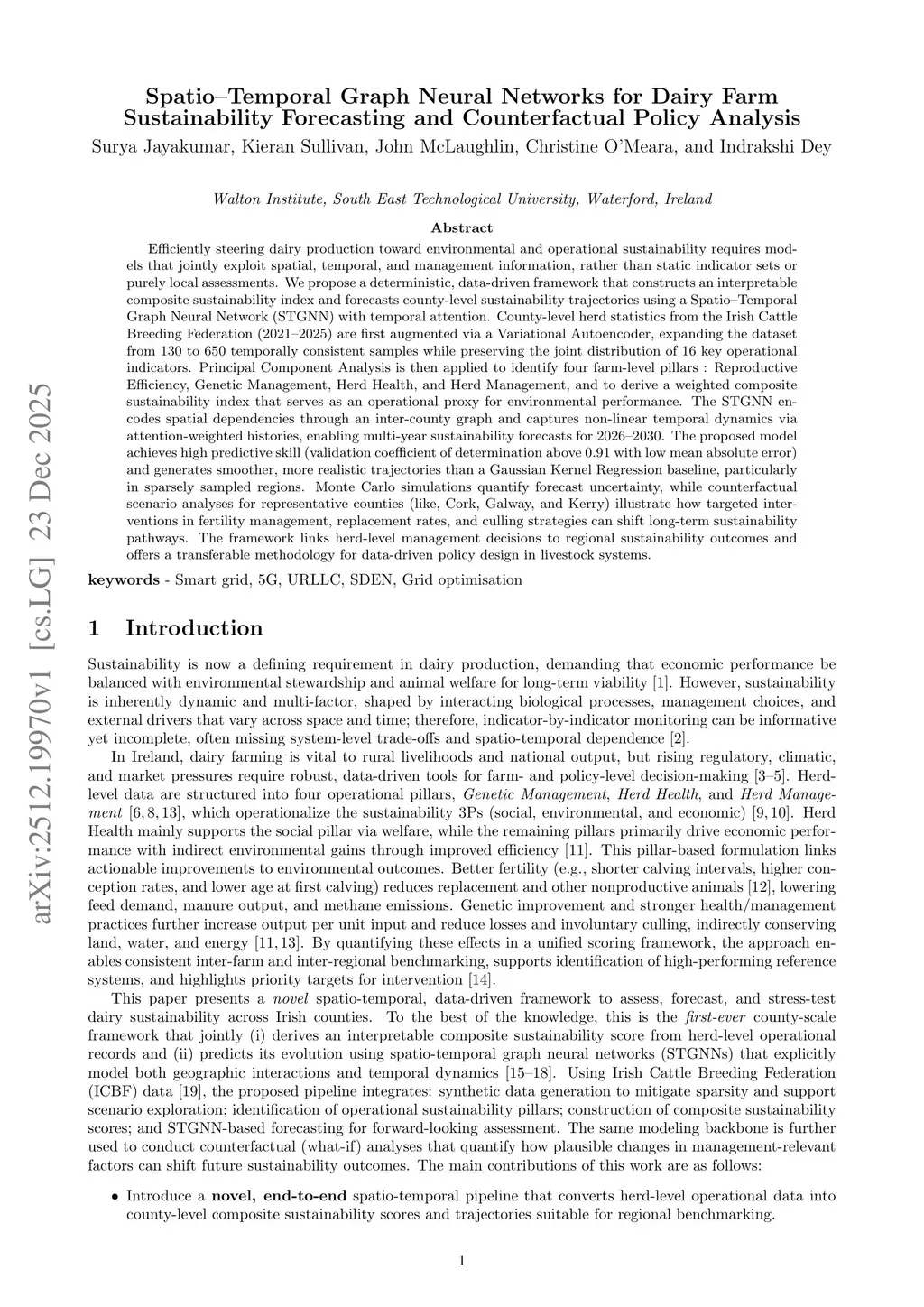 This study introduces a novel data-driven framework and the first-ever county-scale application of Spatio-Temporal Graph Neural Networks (STGNN) to forecast composite sustainability indices from herd-level operational records. The methodology employs a novel, end-to-end pipeline utilizing a Variational Autoencoder (VAE) to augment Irish Cattle Breeding Federation (ICBF) datasets, preserving joint distributions while mitigating sparsity. A first-ever pillar-based scoring formulation is derived via Principal Component Analysis, identifying Reproductive Efficiency, Genetic Management, Herd Health, and Herd Management, to construct weighted composite indices. These indices are modelled using a novel STGNN architecture that explicitly encodes geographic dependencies and non-linear temporal dynamics to generate multi-year forecasts for 2026-2030.