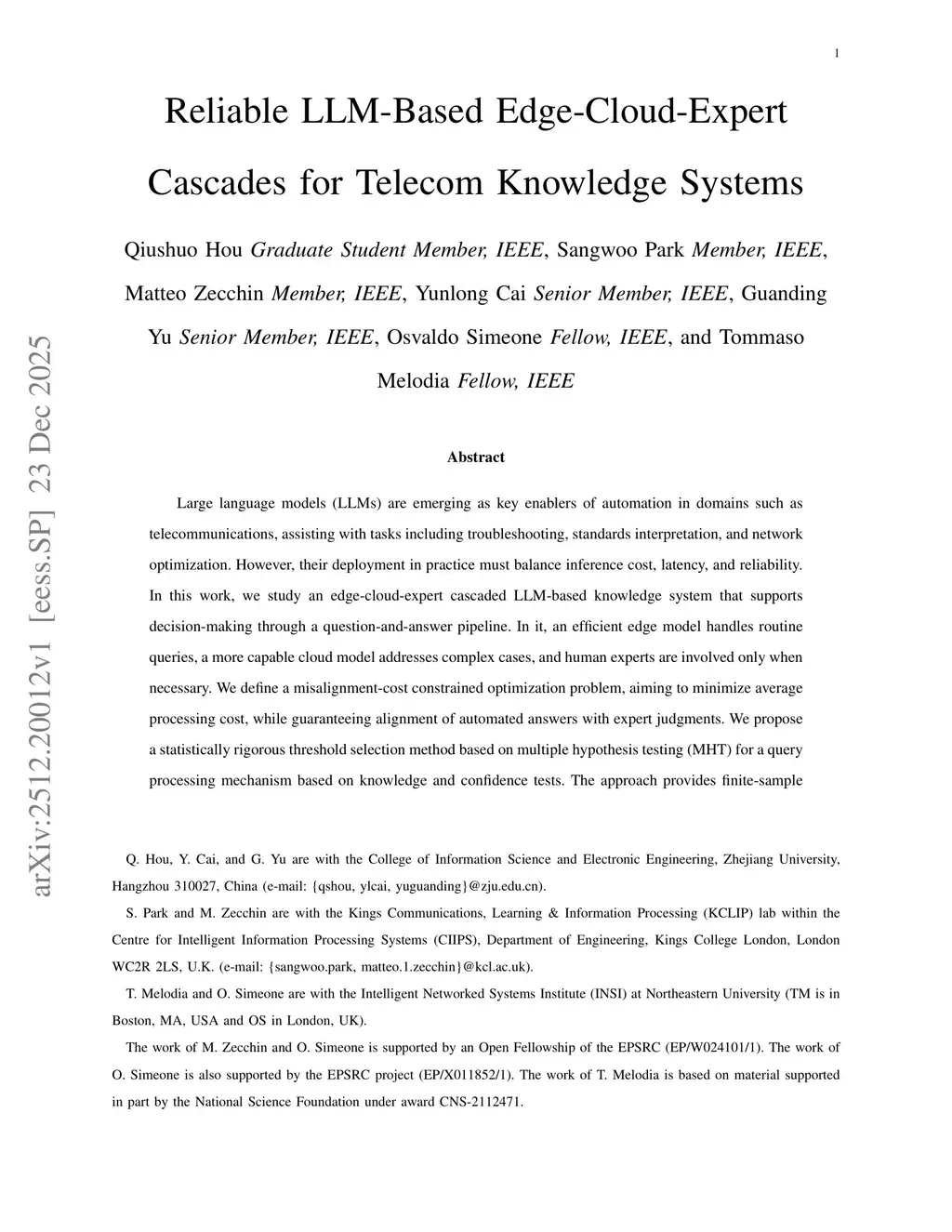 Large language models (LLMs) are emerging as key enablers of automation in domains such as telecommunications, assisting with tasks including troubleshooting, standards interpretation, and network optimization. However, their deployment in practice must balance inference cost, latency, and reliability. In this work, we study an edge-cloud-expert cascaded LLM-based knowledge system that supports decision-making through a question-and-answer pipeline. In it, an efficient edge model handles routine queries, a more capable cloud model addresses complex cases, and human experts are involved only when necessary. We define a misalignment-cost constrained optimization problem, aiming to minimize average processing cost, while guaranteeing alignment of automated answers with expert judgments. We propose a statistically rigorous threshold selection method based on multiple hypothesis testing (MHT) for a query processing mechanism based on knowledge and confidence tests. The approach provides finite-sample guarantees on misalignment risk. Experiments on the TeleQnA dataset -- a telecom-specific benchmark -- demonstrate that the proposed method achieves superior cost-efficiency compared to conventional cascaded baselines, while ensuring reliability at prescribed confidence levels.