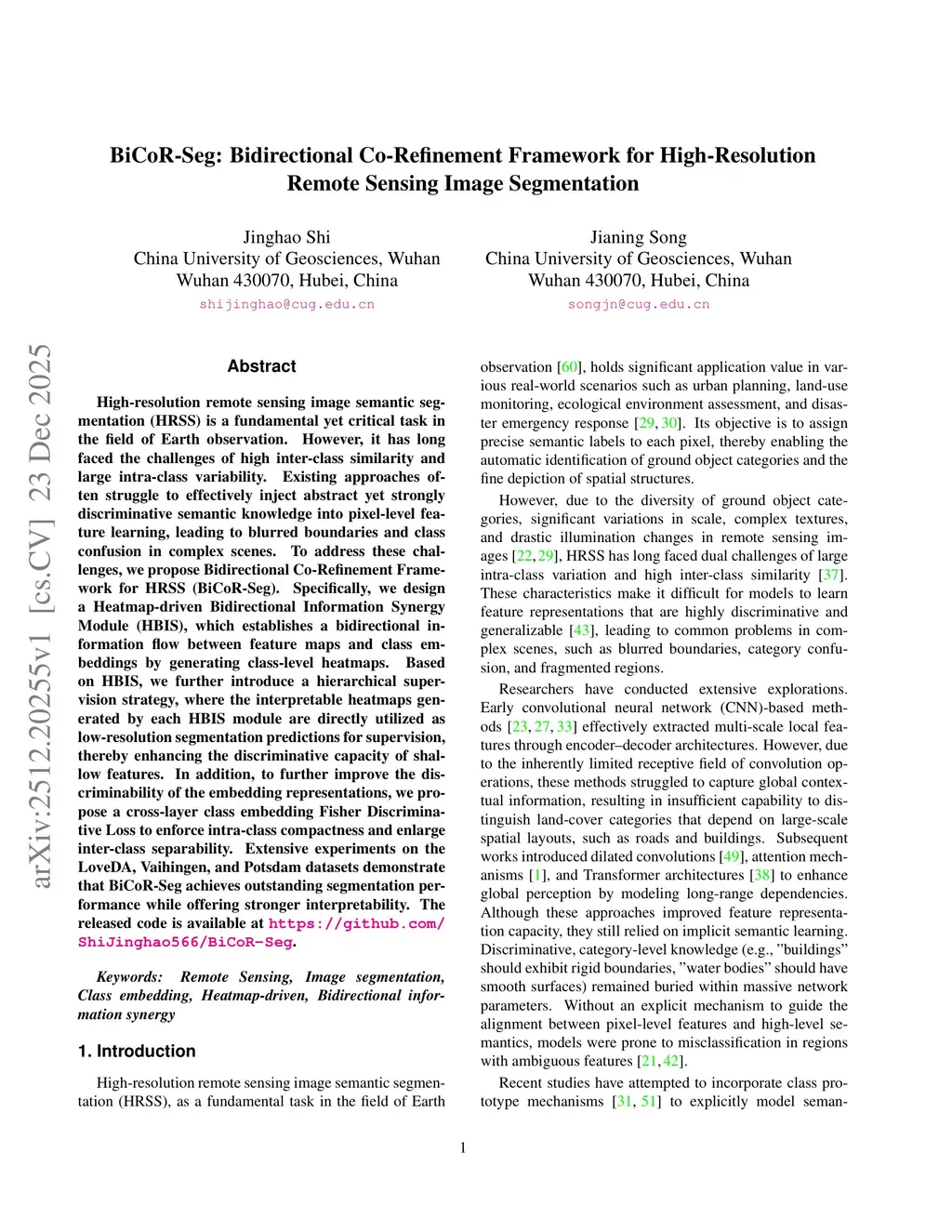 High-resolution remote sensing image semantic segmentation (HRSS) is a fundamental yet critical task in the field of Earth observation. However, it has long faced the challenges of high inter-class similarity and large intra-class variability. Existing approaches often struggle to effectively inject abstract yet strongly discriminative semantic knowledge into pixel-level feature learning, leading to blurred boundaries and class confusion in complex scenes. To address these challenges, we propose Bidirectional Co-Refinement Framework for HRSS (BiCoR-Seg). Specifically, we design a Heatmap-driven Bidirectional Information Synergy Module (HBIS), which establishes a bidirectional information flow between feature maps and class embeddings by generating class-level heatmaps. Based on HBIS, we further introduce a hierarchical supervision strategy, where the interpretable heatmaps generated by each HBIS module are directly utilized as low-resolution segmentation predictions for supervision, thereby enhancing the discriminative capacity of shallow features. In addition, to further improve the discriminability of the embedding representations, we propose a cross-layer class embedding Fisher Discriminative Loss to enforce intra-class compactness and enlarge inter-class separability. Extensive experiments on the LoveDA, Vaihingen, and Potsdam datasets demonstrate that BiCoR-Seg achieves outstanding segmentation performance while offering stronger interpretability. The released code is available atthis https URL.