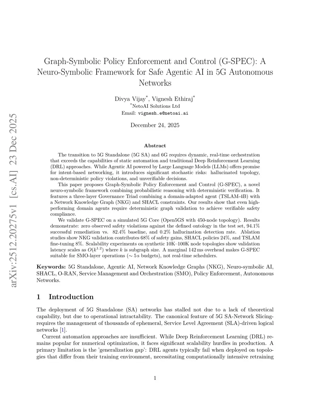 As networks evolve toward 5G Standalone and 6G, operators face orchestration challenges that exceed the limits of static automation and Deep Reinforcement Learning. Although Large Language Model (LLM) agents offer a path toward intent-based networking, they introduce stochastic risks, including topology hallucinations and policy non-compliance. To mitigate this, we propose Graph-Symbolic Policy Enforcement and Control (G-SPEC), a neuro-symbolic framework that constrains probabilistic planning with deterministic verification. The architecture relies on a Governance Triad - a telecom-adapted agent (TSLAM-4B), a Network Knowledge Graph (NKG), and SHACL constraints. We evaluated G-SPEC on a simulated 450-node 5G Core, achieving zero safety violations and a 94.1% remediation success rate, significantly outperforming the 82.4% baseline. Ablation analysis indicates that NKG validation drives the majority of safety gains (68%), followed by SHACL policies (24%). Scalability tests on topologies ranging from 10K to 100K nodes demonstrate that validation latency scales as where is subgraph size. With a processing overhead of 142ms, G-SPEC is viable for SMO-layer operations.