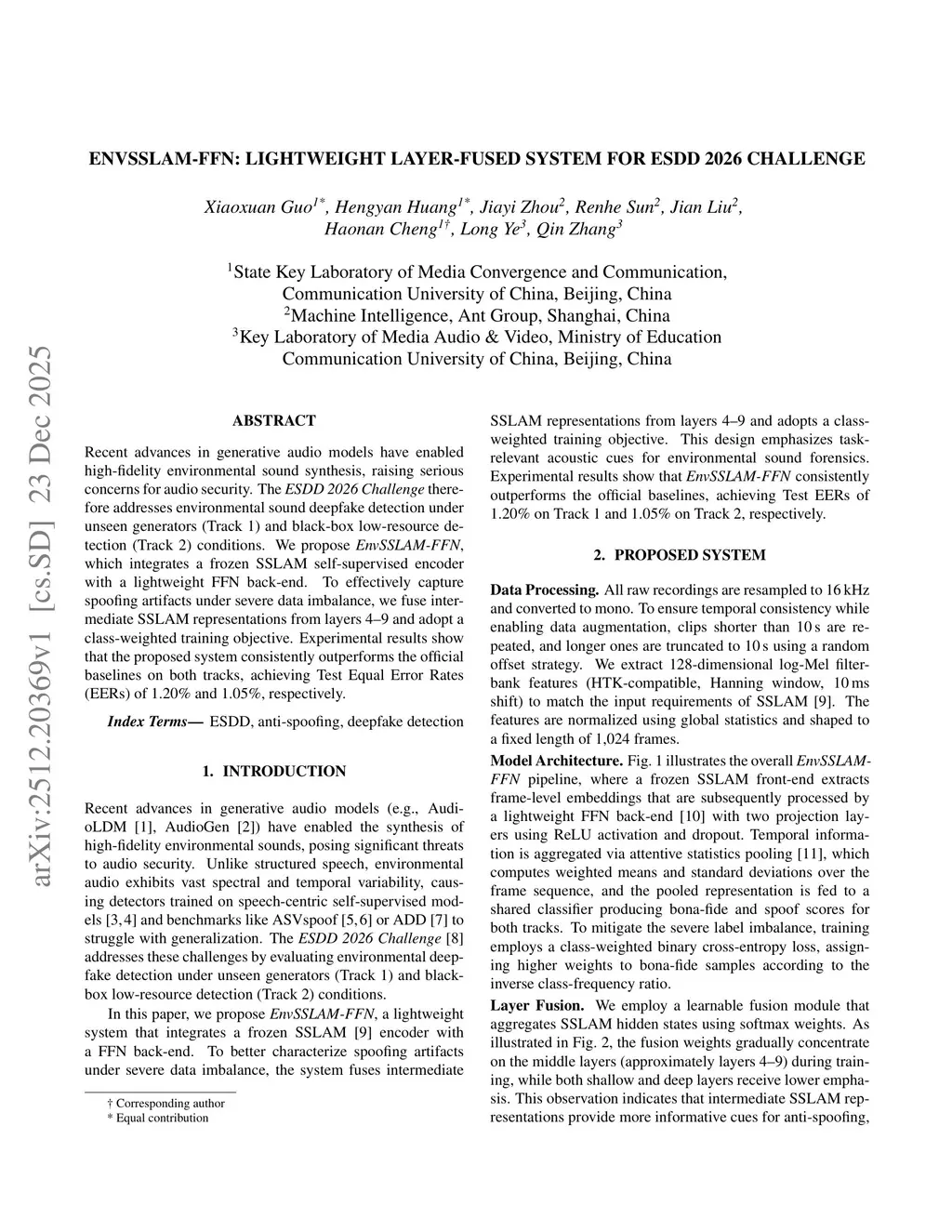 EnvSSLAM-FFN: Lightweight Layer-Fused System for ESDD 2026 Challenge