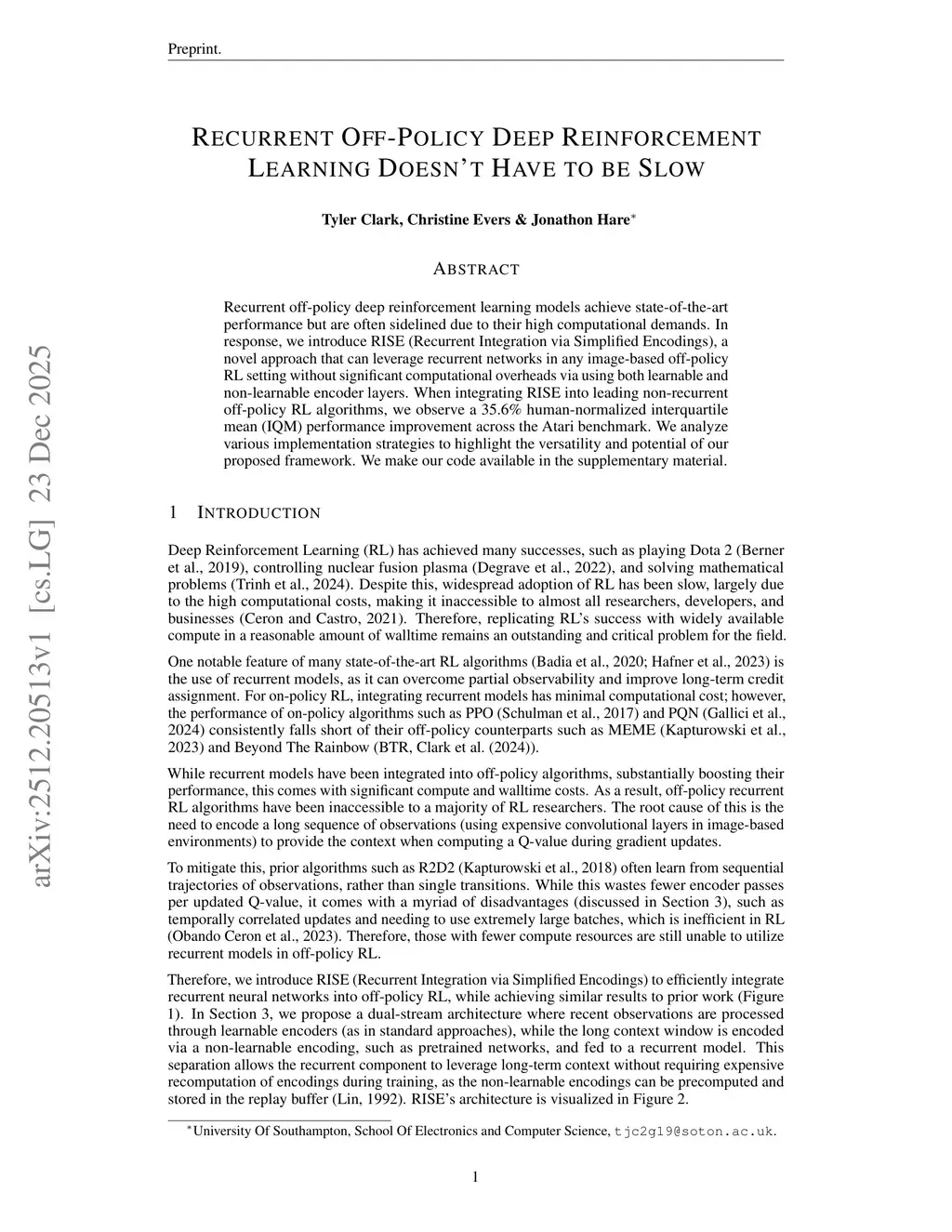 Recurrent off-policy deep reinforcement learning models achieve state-of-the-art performance but are often sidelined due to their high computational demands. In response, we introduce RISE (Recurrent Integration via Simplified Encodings), a novel approach that can leverage recurrent networks in any image-based off-policy RL setting without significant computational overheads via using both learnable and non-learnable encoder layers. When integrating RISE into leading non-recurrent off-policy RL algorithms, we observe a 35.6% human-normalized interquartile mean (IQM) performance improvement across the Atari benchmark. We analyze various implementation strategies to highlight the versatility and potential of our proposed framework.