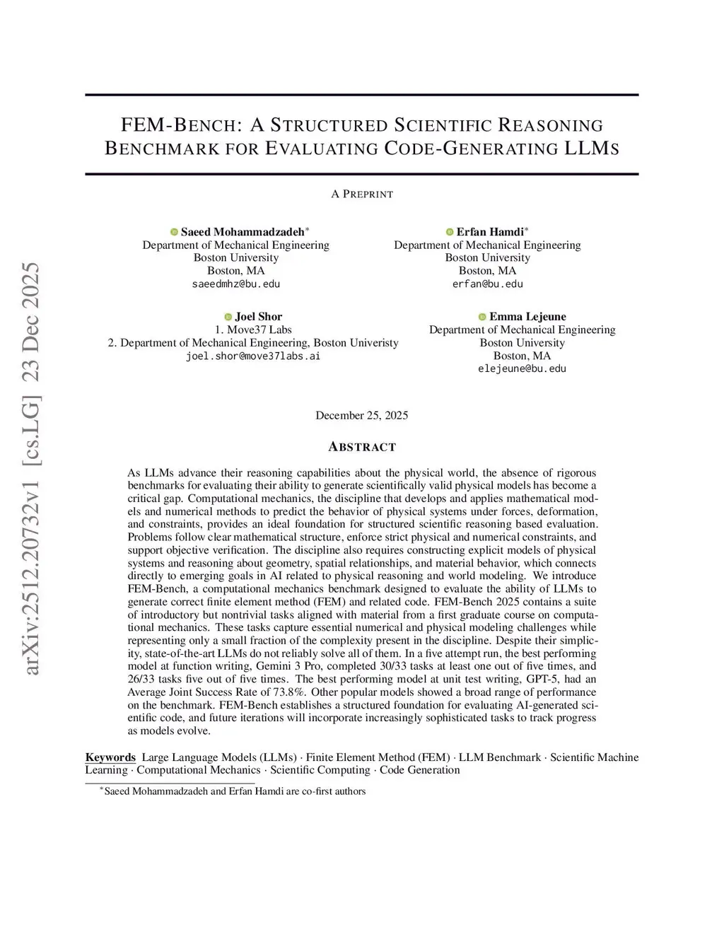 As LLMs advance their reasoning capabilities about the physical world, the absence of rigorous benchmarks for evaluating their ability to generate scientifically valid physical models has become a critical gap. Computational mechanics, which develops and applies mathematical models and numerical methods to predict the behavior of physical systems under forces, deformation, and constraints, provides an ideal foundation for structured scientific reasoning evaluation. Problems follow clear mathematical structure, enforce strict physical and numerical constraints, and support objective verification. The discipline requires constructing explicit models of physical systems and reasoning about geometry, spatial relationships, and material behavior, connecting directly to emerging AI goals in physical reasoning and world modeling. We introduce FEM-Bench, a computational mechanics benchmark designed to evaluate the ability of LLMs to generate correct finite element method (FEM) and related code. FEM-Bench 2025 contains a suite of introductory but nontrivial tasks aligned with material from a first graduate course on computational mechanics. These tasks capture essential numerical and physical modeling challenges while representing only a small fraction of the complexity present in the discipline. Despite their simplicity, state-of-the-art LLMs do not reliably solve all of them. In a five attempt run, the best performing model at function writing, Gemini 3 Pro, completed 30/33 tasks at least once and 26/33 tasks all five times. The best performing model at unit test writing, GPT-5, had an Average Joint Success Rate of 73.8%. Other popular models showed broad performance variation. FEM-Bench establishes a structured foundation for evaluating AI-generated scientific code, and future iterations will incorporate increasingly sophisticated tasks to track progress as models evolve.