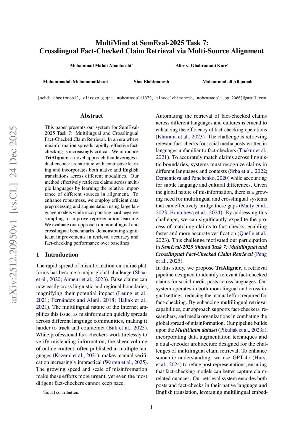 This paper presents our system for SemEval-2025 Task 7: Multilingual and Crosslingual Fact-Checked Claim Retrieval. In an era where misinformation spreads rapidly, effective fact-checking is increasingly critical. We introduce TriAligner, a novel approach that leverages a dual-encoder architecture with contrastive learning and incorporates both native and English translations across different modalities. Our method effectively retrieves claims across multiple languages by learning the relative importance of different sources in alignment. To enhance robustness, we employ efficient data preprocessing and augmentation using large language models while incorporating hard negative sampling to improve representation learning. We evaluate our approach on monolingual and crosslingual benchmarks, demonstrating significant improvements in retrieval accuracy and fact-checking performance over baselines.