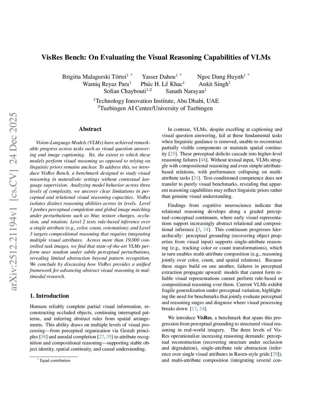 Vision-Language Models (VLMs) have achieved remarkable progress across tasks such as visual question answering and image captioning. Yet, the extent to which these models perform visual reasoning as opposed to relying on linguistic priors remains unclear. To address this, we introduce VisRes Bench, a benchmark designed to study visual reasoning in naturalistic settings without contextual language supervision. Analyzing model behavior across three levels of complexity, we uncover clear limitations in perceptual and relational visual reasoning capacities. VisRes isolates distinct reasoning abilities across its levels. Level 1 probes perceptual completion and global image matching under perturbations such as blur, texture changes, occlusion, and rotation; Level 2 tests rule-based inference over a single attribute (e.g., color, count, orientation); and Level 3 targets compositional reasoning that requires integrating multiple visual attributes. Across more than 19,000 controlled task images, we find that state-of-the-art VLMs perform near random under subtle perceptual perturbations, revealing limited abstraction beyond pattern recognition. We conclude by discussing how VisRes provides a unified framework for advancing abstract visual reasoning in multimodal research.